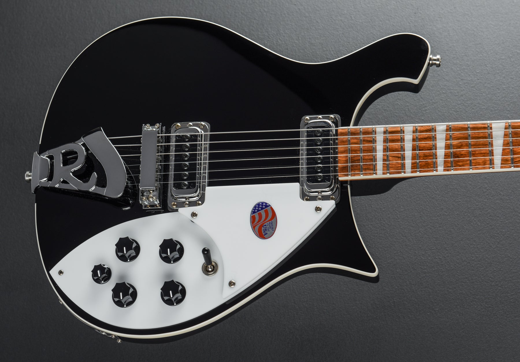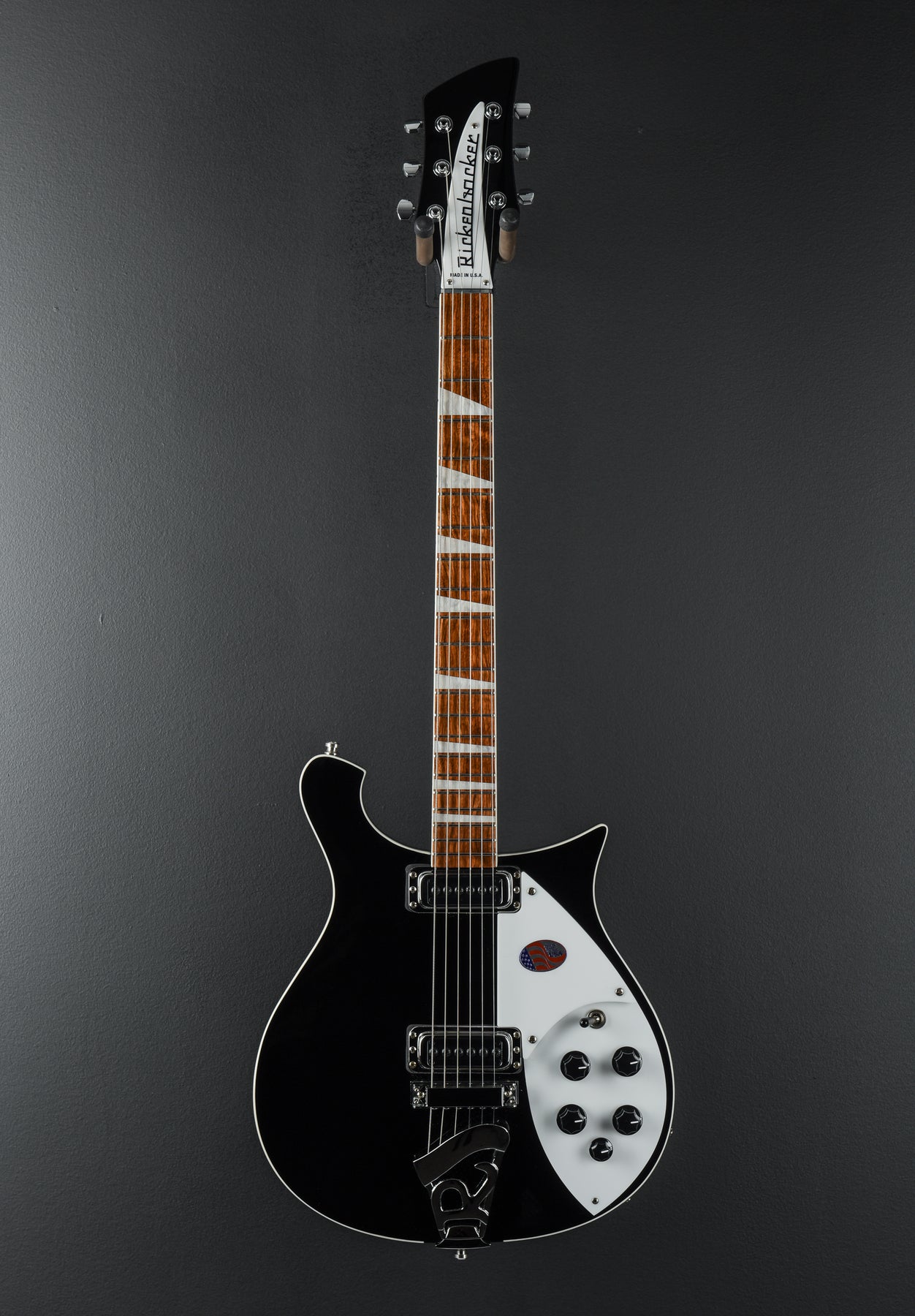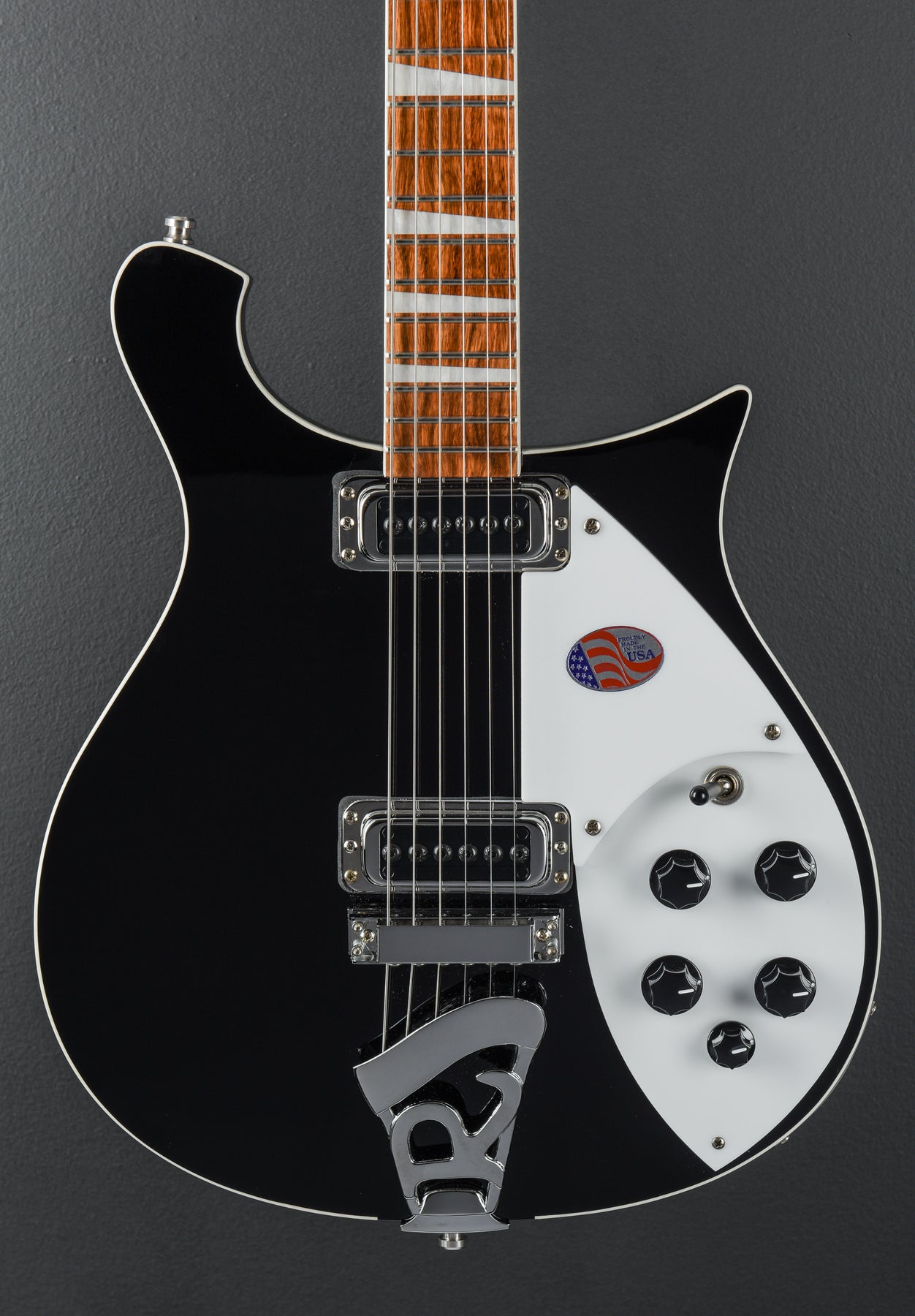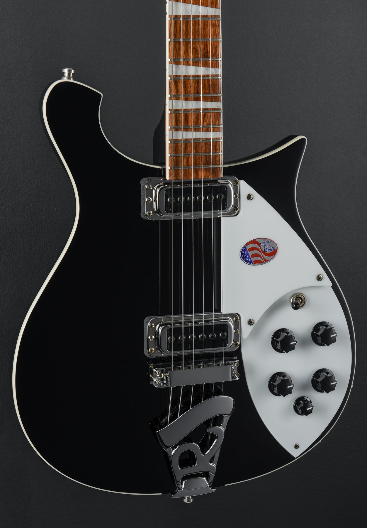 Jetglo Finish, Maple Body Wings with a Thru-Body Maple Neck, Bound 10" Radius Rosewood Fingerboard with Triangle Inlays, 24.75" Scale Length, 1.63" Nut Width, Rickenbacker Hi-Gain Bridge and Neck Pickups, 3-Way Toggle Switching with Individual Volume and Tone Controls Plus Bass Blend Control, Ric-O-Sound and Standard Output Jacks, 6-Saddle Bridge and “R” Tailpiece, Gotoh Tuners, 7.8 Pounds, With Hardshell Case.
