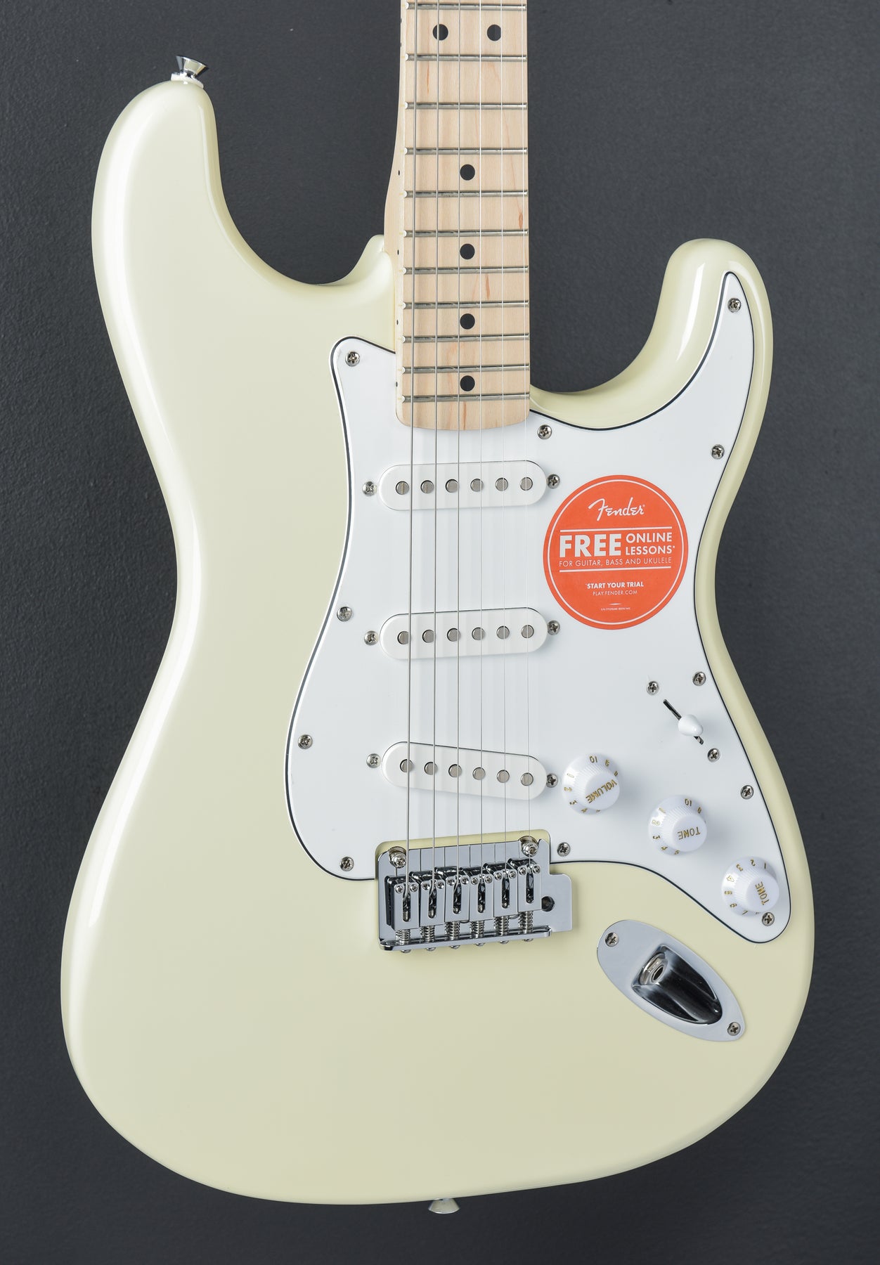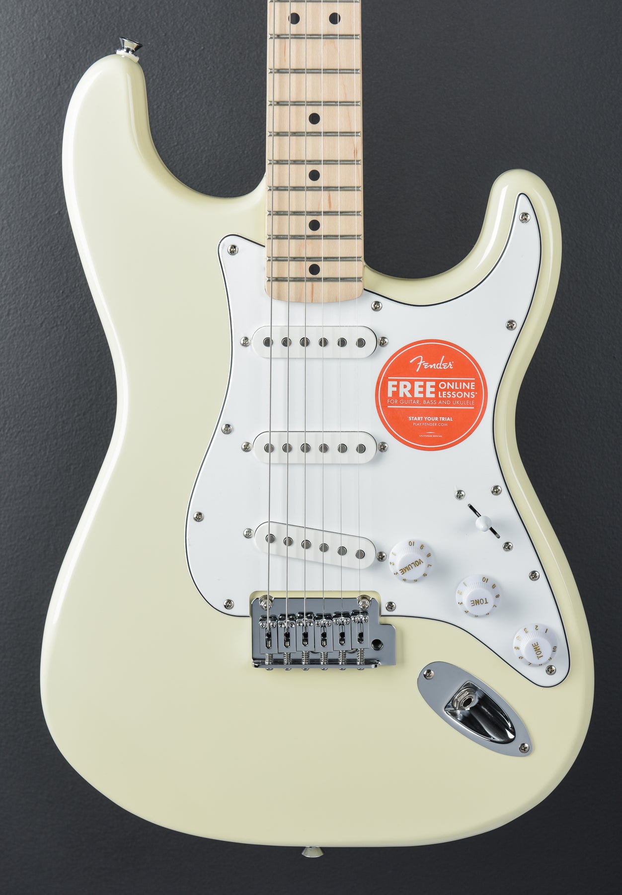 Brand New, Olympic White Finish, Poplar Body with a Gloss Polyurethane Finish, “C” Shaped Maple Neck with a Satin Urethane Finish and a 9.5" Radius Maple Fingerboard with Medium Jumbo Frets, 25.5" Scale Length, 1.65" Synthetic Bone Nut Width, Ceramic Single-Coil Strat Pickups, 5-Way Switching with the Master Volume and Tone 1 (Neck/Middle Pickups) and Tone 2 (Bridge Pickup) Controls, 2-Point Synchronized Tremolo with Block Saddles, Sealed Die-Cast Tuners with Split Shafts, 7.0 Pounds, No Case or Gig Bag Included.