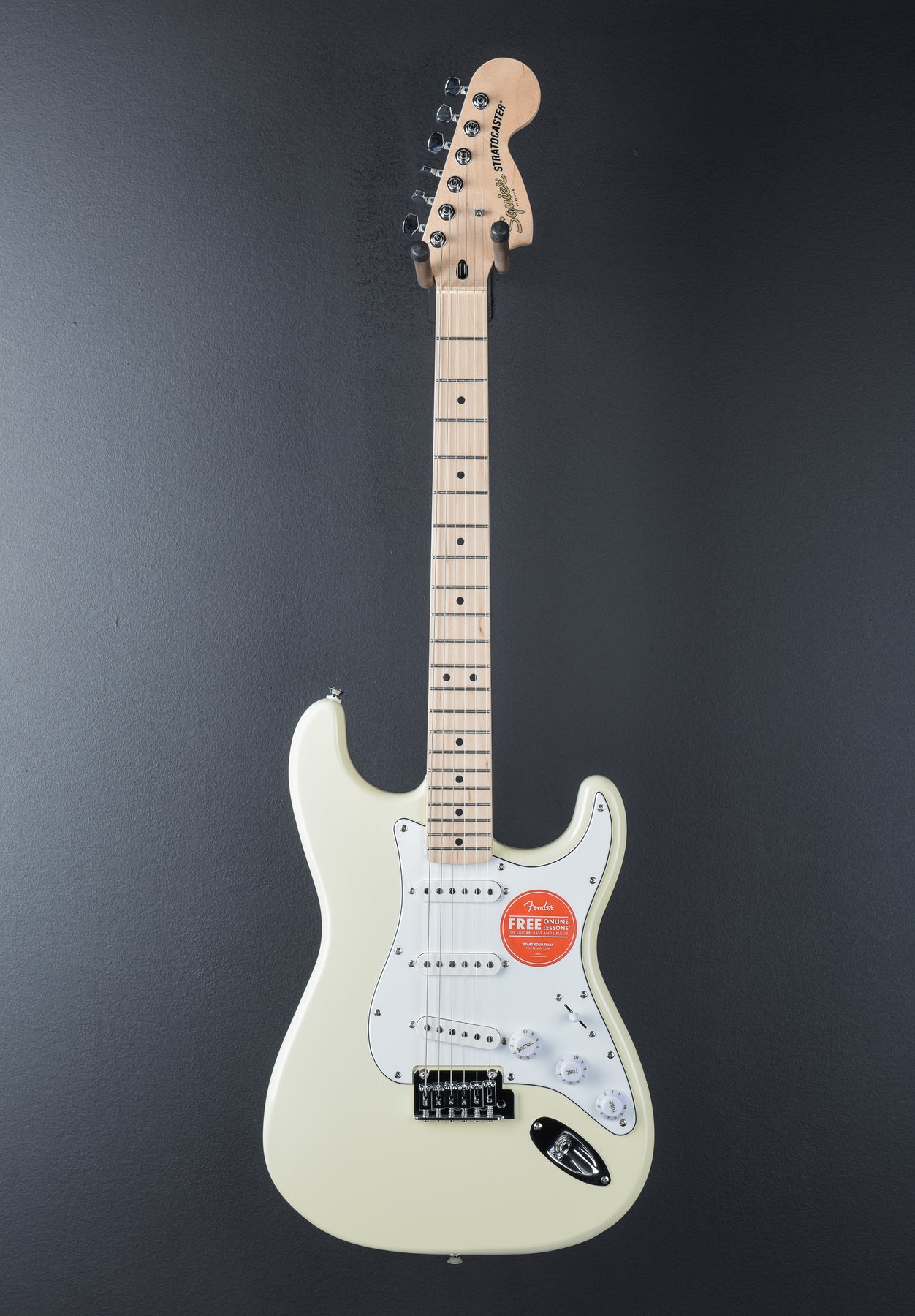 "A superb gateway into the time-honored Fender® family, the Squier® Affinity Series® Stratocaster® delivers legendary design and quintessential tone for today's aspiring guitar hero. This Strat® features several player-friendly refinements such as a thin and lightweight body, a slim and comfortable "C"-shaped neck profile, a 2-point tremolo bridge for superior tremolo action and sealed die-cast tuning machines with split shafts for smooth, accurate tuning and easy restringing. Loaded with a trio of Squier single-coil Strat pickups with 5-way switching for genre-defying sonic variety, this model is ready to accompany any player at any stage."