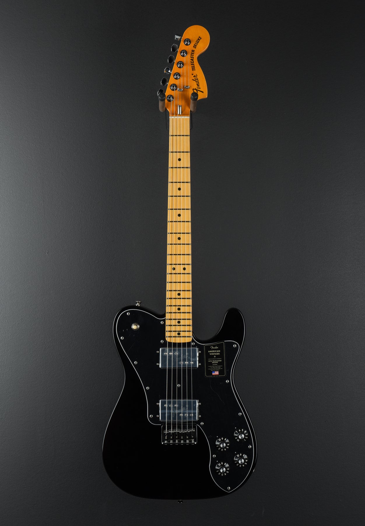 Featuring a ‘75 “C”-shape hard rock maple neck, the American Vintage II 1975 Telecaster Deluxe plays like a dream with a 9.5” radius maple fingerboard and medium jumbo frets. Characteristic of production in 1975, this Telecaster is outfitted with a convenient "Bullet" style truss rod nut, three-bolt neck plate with Micro-Tilt™ mechanism and offered in Black, Mocha Brown, or 3-Color Sunburst over an alder body. Other features include a 6-Saddle hardtail bridge with stainless steel block saddles and vintage-accurate Tele® Deluxe tuners.