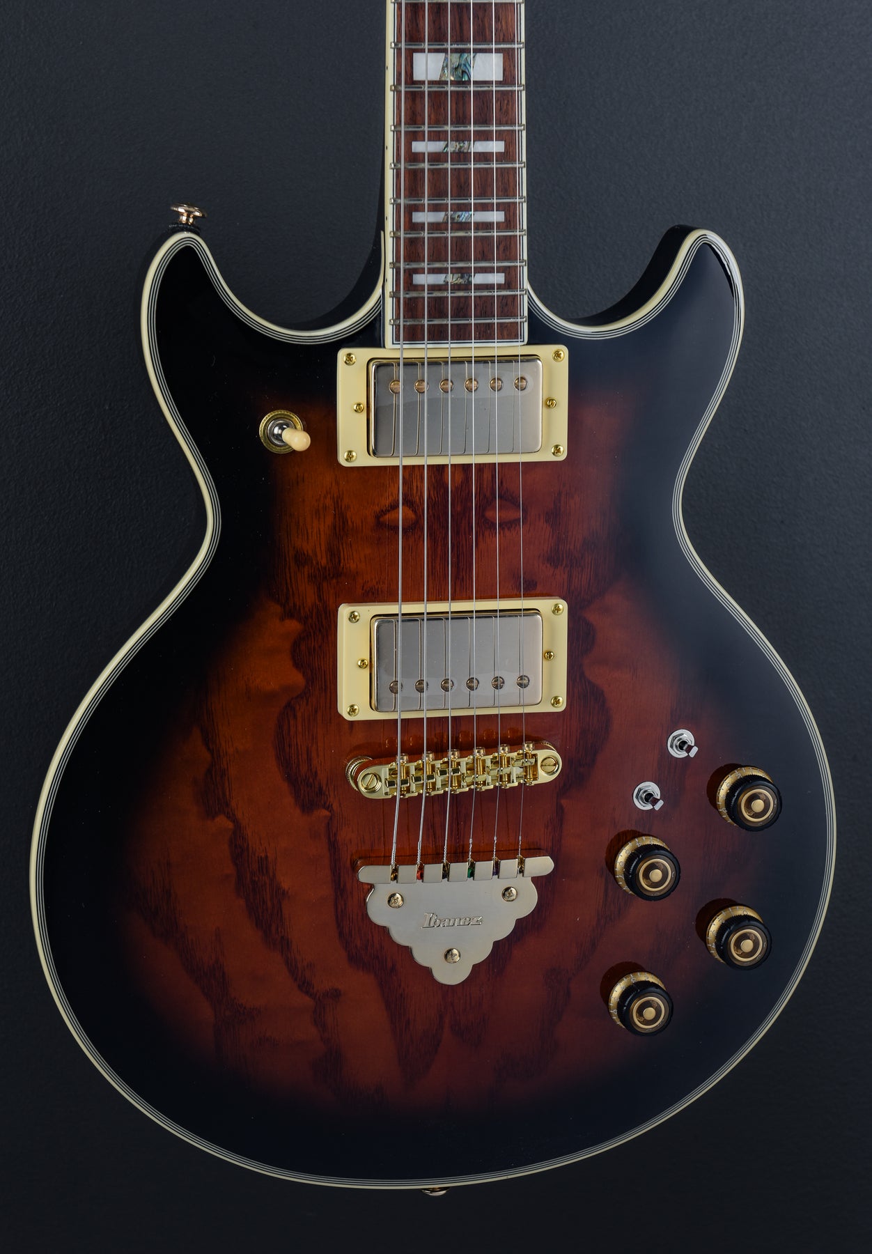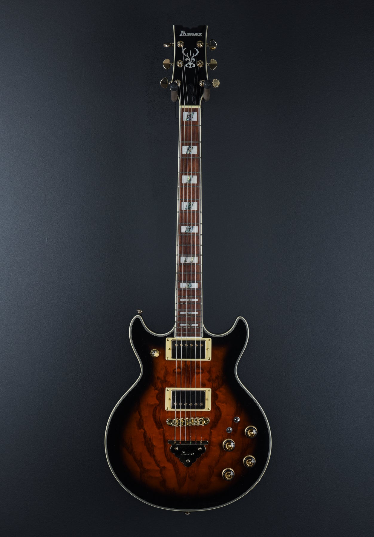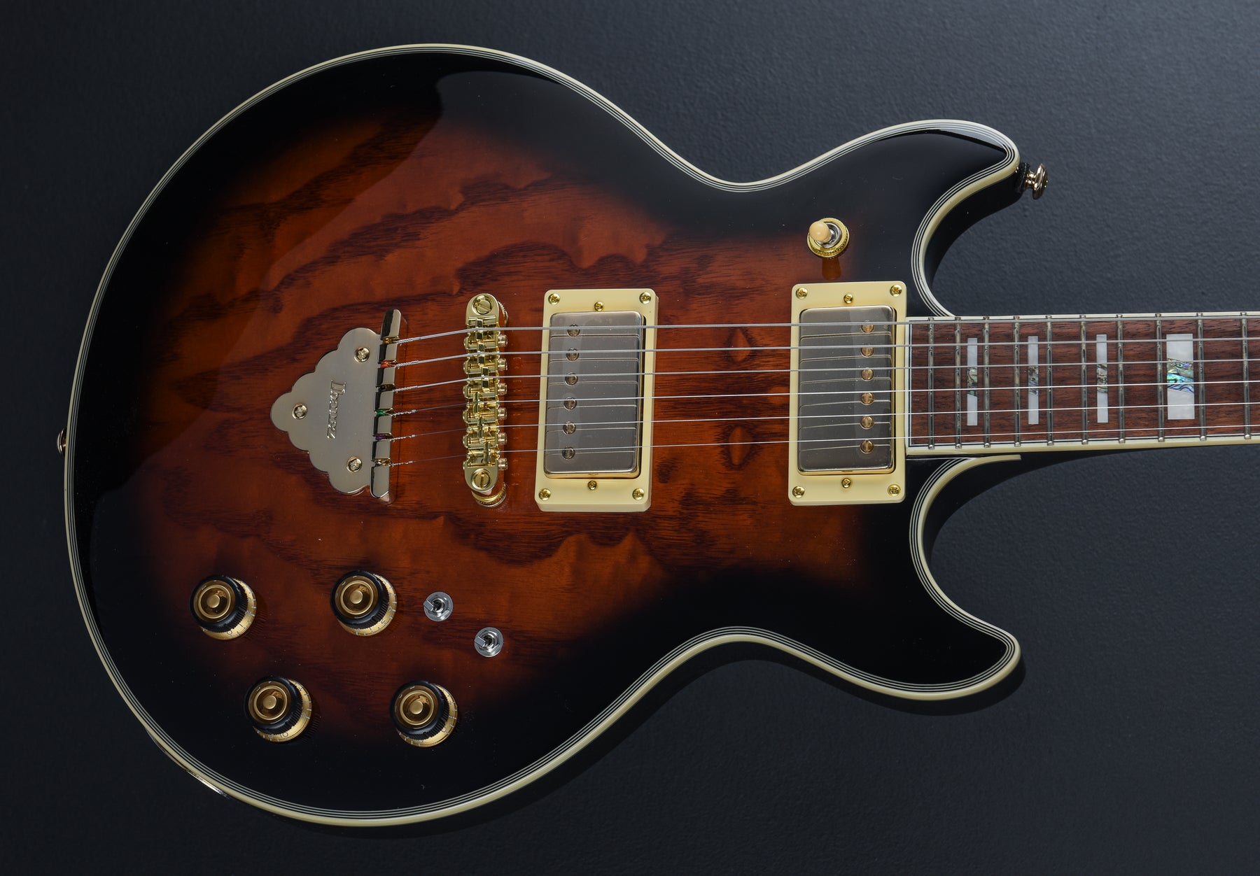Brand New, Dark Brown Sunburst, Quilted Ash Top, Okoume Body, AR 3-piece Maple set-in Neck, Bound Jatoba fretboard with Acrylic and Abalone block inlays, 22 Medium frets, 24.7" Scale length, Ibanez Super 58 neck and bridge pickups w/ Volume and Tone for each, Tri-Sound switch for neck and bridge pickups, Gibraltar Performer bridge, Quick Change Classic tail piece, 7.6 lbs, no case or gig bag.