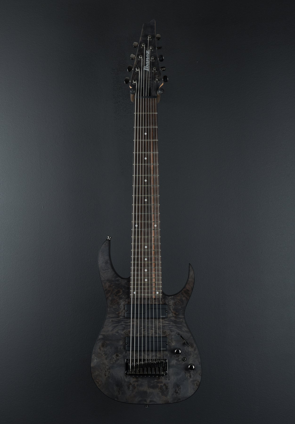 Brand New, Transparent Gray Flat, Nyatoh body with Poplar Burl top, Wizard-9 5 piece Maple/Walnut Neck, Macassar Ebony fretboard w/ white dot inlay, 24 Jumbo Frets, Fishman Fluence Modern Humbucker Alnico 9 Neck pickup, Fishman Fluence Modern Humbucker Ceramic 9 Bridge Pickup, Fishman Fluence Voicing switch, 3-way pickup selector, Volume with push/pull Fishman Fluence Voicing selection, Master tone, Gibraltar Standard II-9 bridge, 8.5 Pounds, No Case or Gig Bag