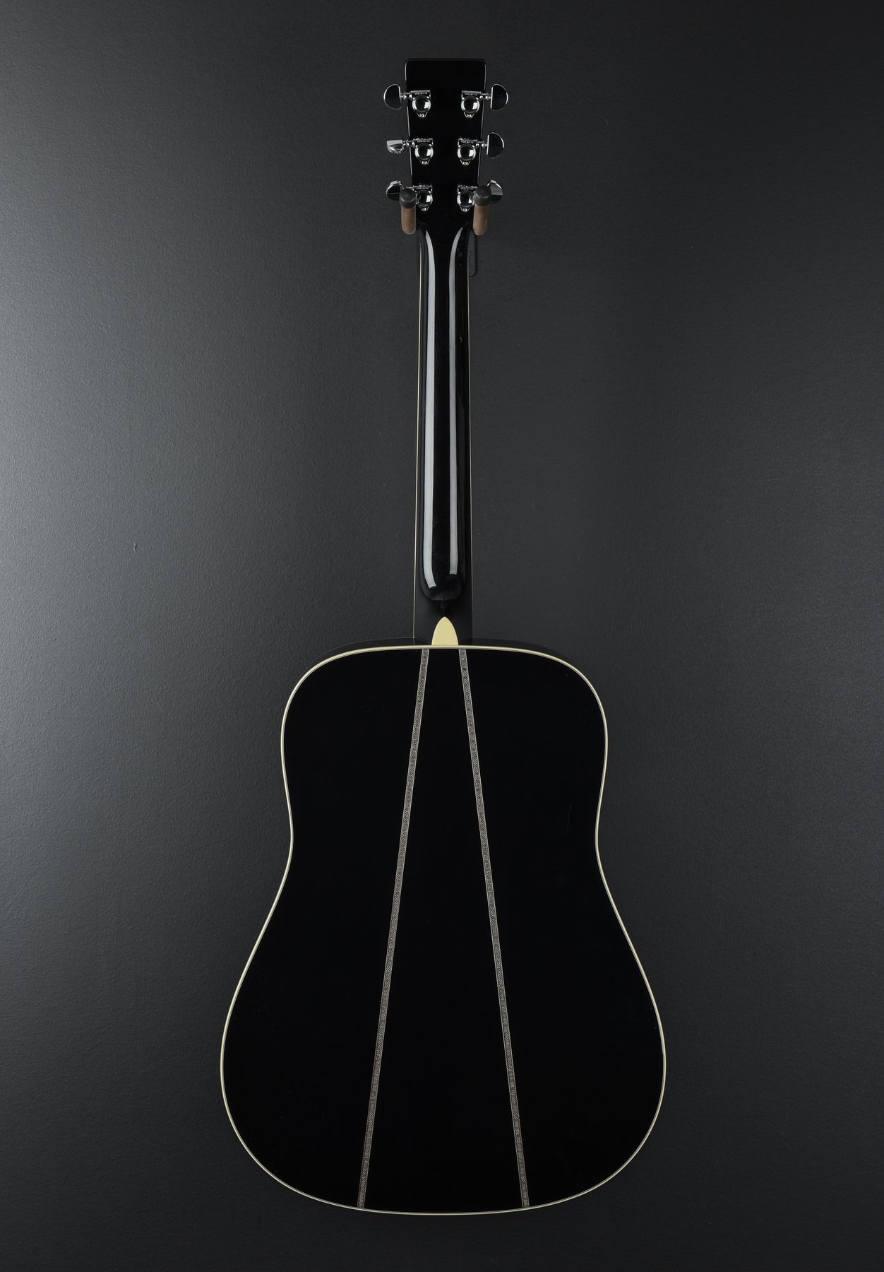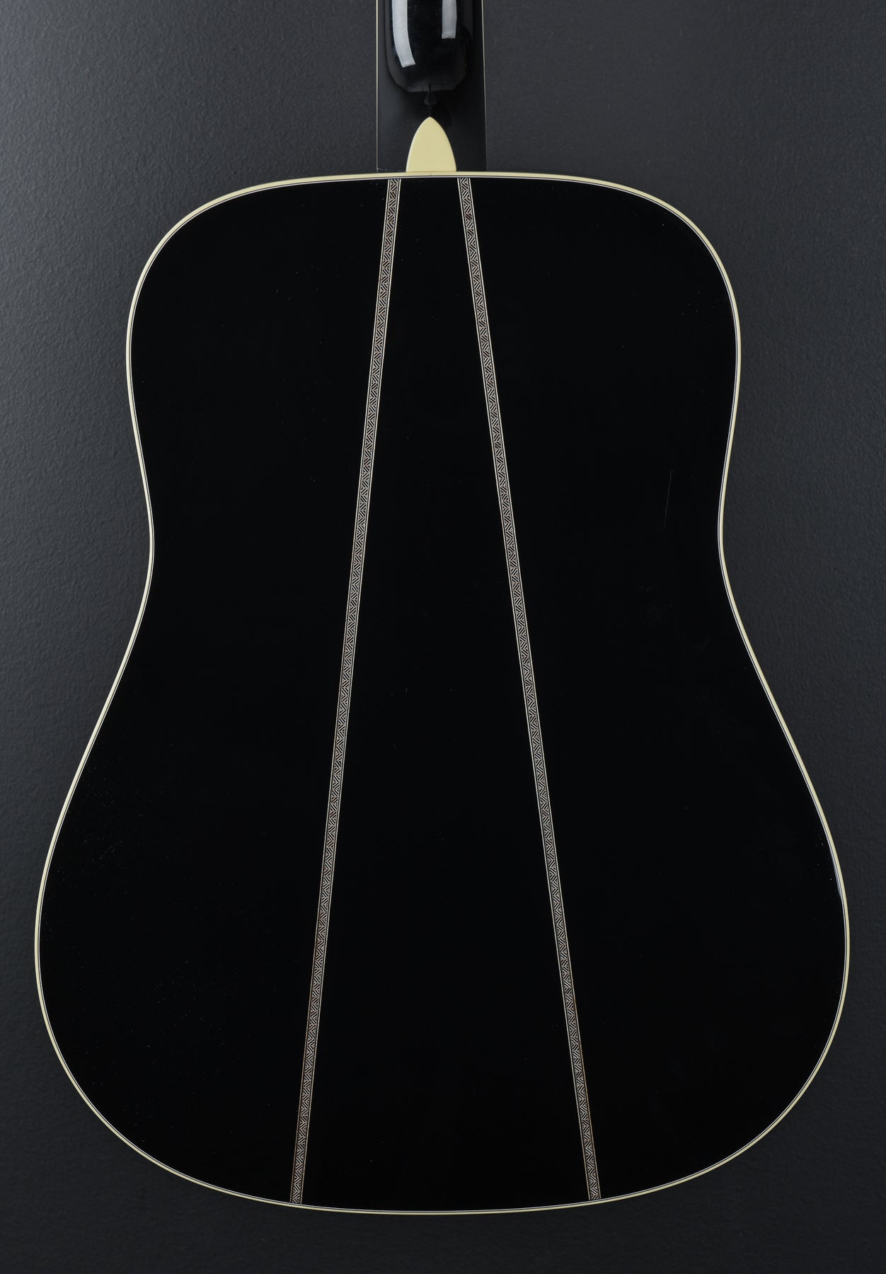Black, D-14 Fret body shape, Engelmann Spruce top, Scalloped forward shifted X bracing, Abalone with multi-stripe Rosette, Grained Ivoroid binding with the multi-stripe top/back/side inlay, Three piece East Indian Rosewood back and East Indian Rosewood sides, Zig-Zag with Black Stripe back purfling, Ebony fingerboard with the Abalone/Mother of Pearl Stars and Johnny Cash Signature position markers on a Modified Low Oval w/standard taper shaped select hardwood neck, 25.4″ scale length, 1 11/16th” nut width, With hardshell case
