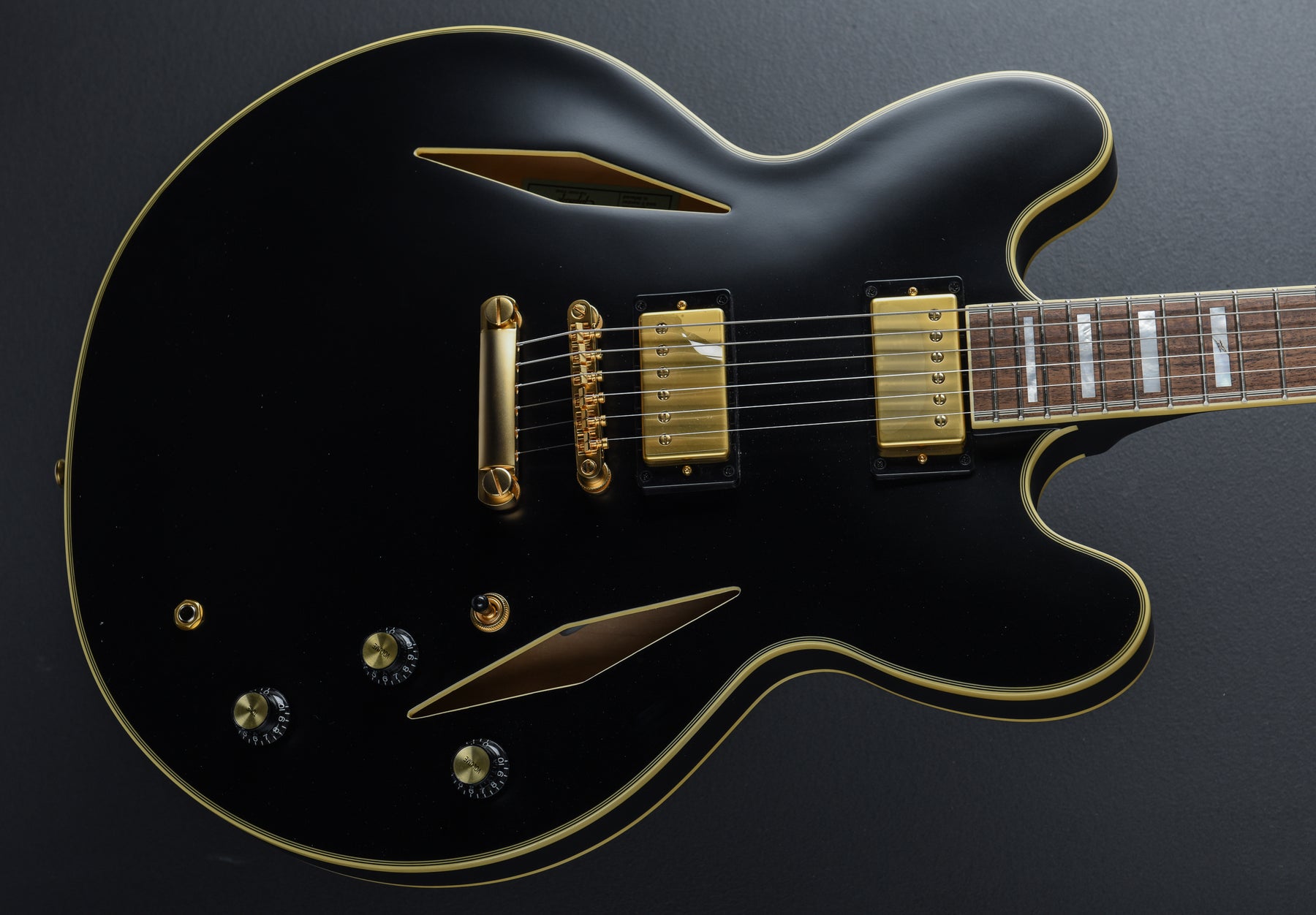 Brand New, Black Aged Gloss, Semi-Hollow Layered Maple Body with the Diamond Sound Holes and a Maple Centerblock, Traditional 60's Slim Taper C Shaped Mahogany Neck, Bound 12” Radius Indian Laurel Fingerboard with the Block Mother of Pearl & Abalone Lightning Bolt Inlays and Medium Jumbo Frets, 24.72” Scale Length, 1.69″ Nut Width, Epiphone Alnico Classic Pro Bridge and Neck Pickups, 3-Way Toggle Switching with the Volume/Volume and Master Tone Controls, LockTone Tune-O-Matic Bridge and Stopbar Tailpiece, Grover Rotomatic Tuners, 8.5lbs, with the EpiLite Case.