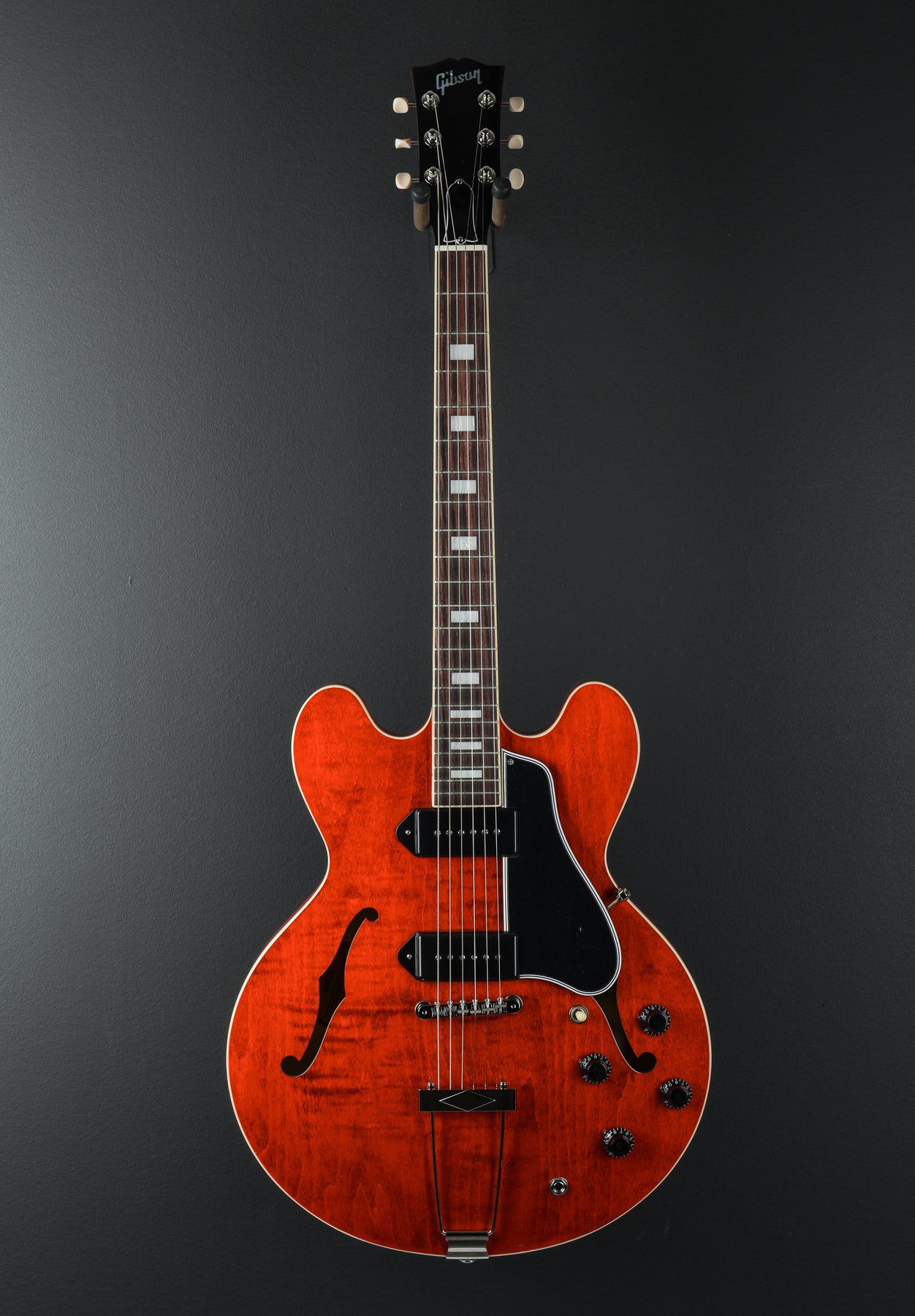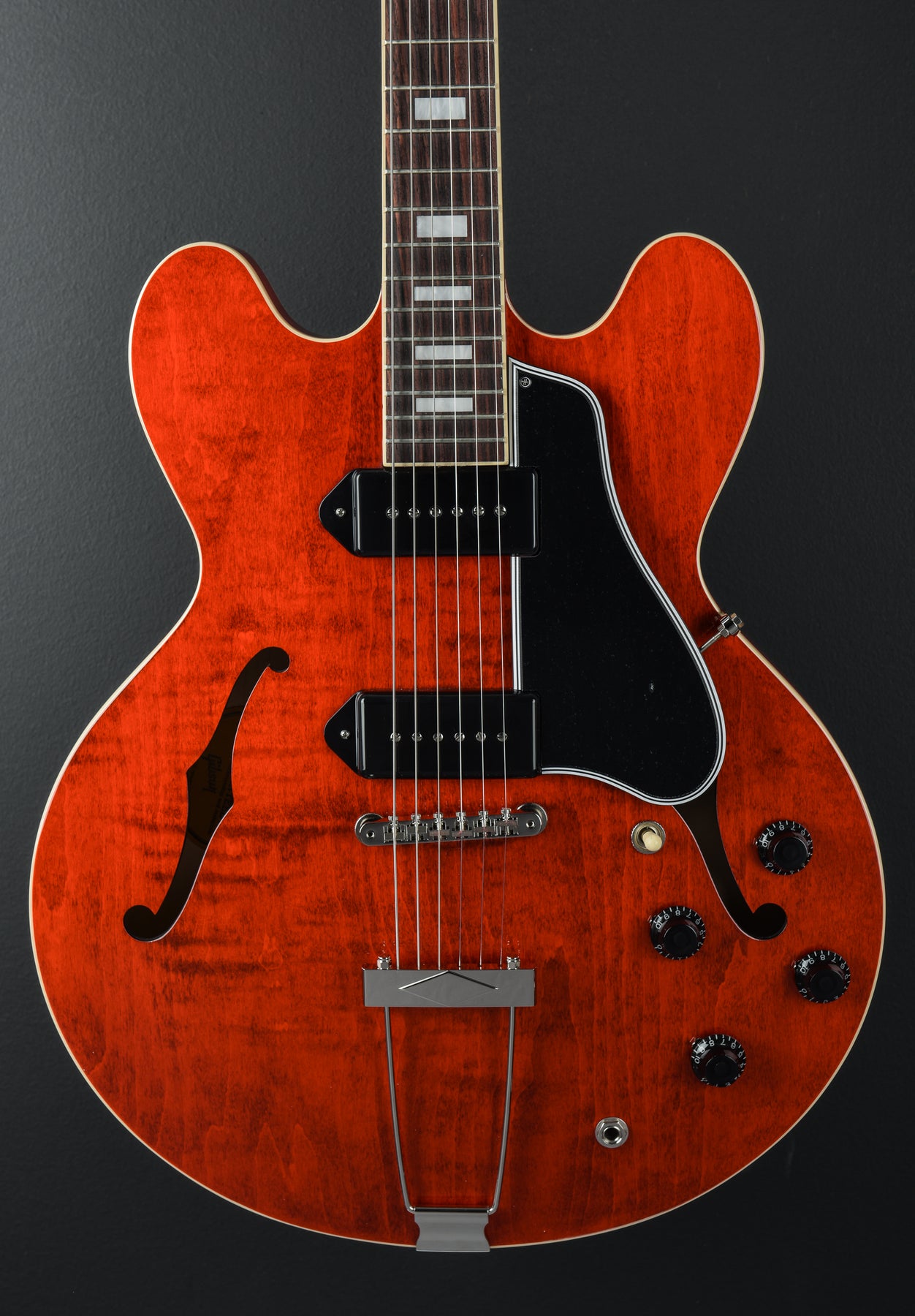 Sixties Cherry, Gloss nitrocellulose lacquer finish, Hollow 3-ply Maple/Poplar/Maple body, Rounded C shaped Mahogany neck, Bound 12” radius Indian Rosewood fingerboard with the acrylic small block inlays and medium jumbo frets, 24.75" scale length, 1.69" nut width, Dogear P-90 bridge and neck pickups, 3-way toggle switching with volume and tone controls for each pickup, ABR-1 tune-o-matic bridge and trapeze tailpiece, Gibson vintage deluxe tuners, 6.3 pounds, With hardshell case