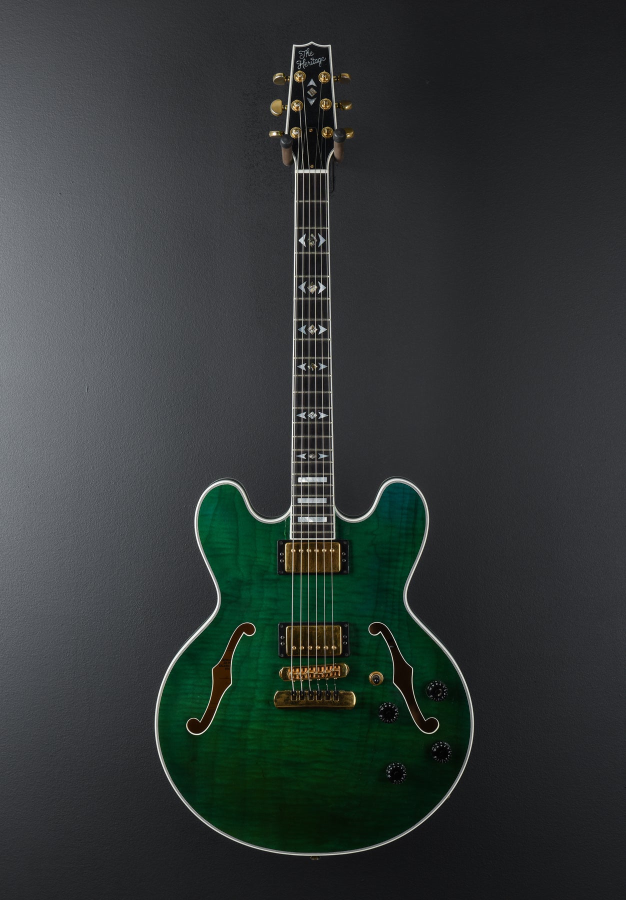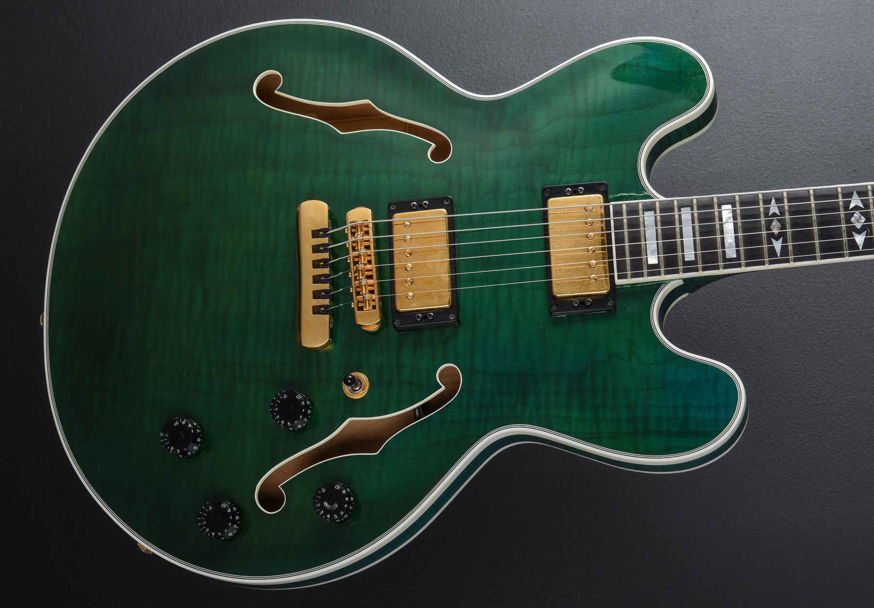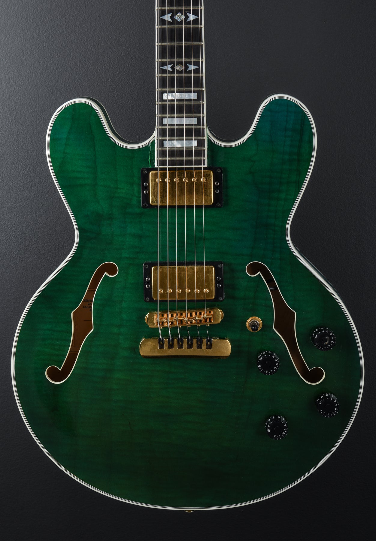 Very Good Condition, Green Emerald Translucent Finish, Semi-Hollow Body, Laminated Arched Curly Maple Top, Back, and Sides, 16" Lower Bout Width, 1.75" Rim Depth, 1-Piece Curly Maple Neck, Ebony Fingerboard with Mother of Pearl and Abalone Inlays, 22 Medium Jumbo Frets, 24.75" Scale Length, 1 11/16" Nut Width, Dual Vintage Range Alnico 5 Magnet Wax-Potted Gold-Covered Humbuckers, Gold Grover Rotomatic Tuners, Gold Plated Hardware, 7.8lbs., Comes with the Original Hardshell Case.