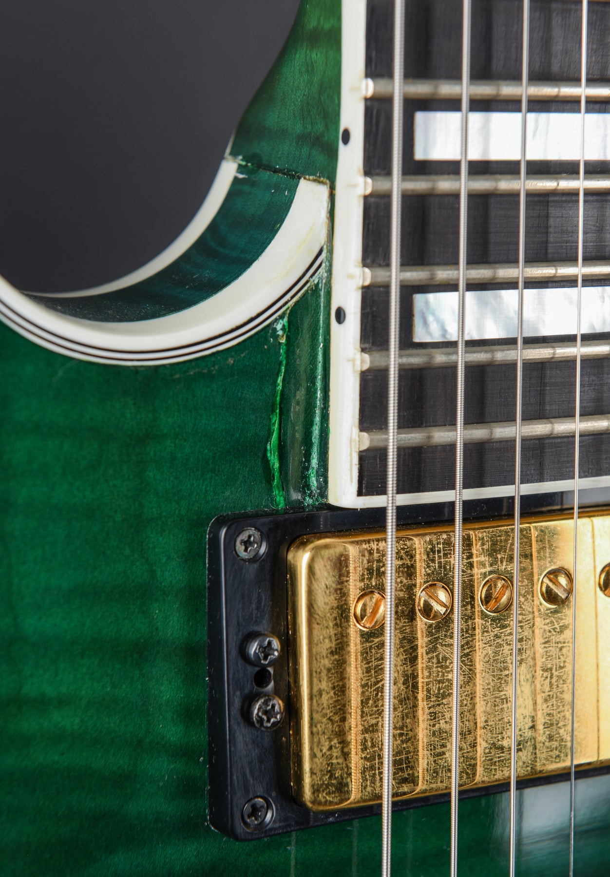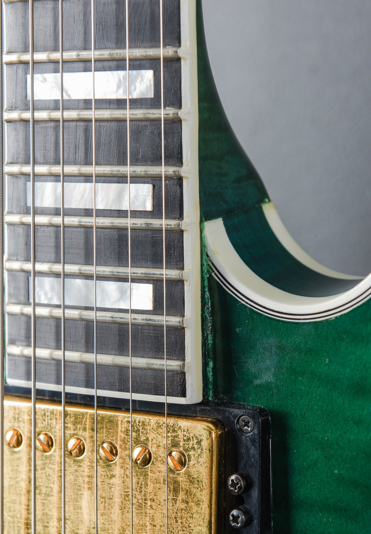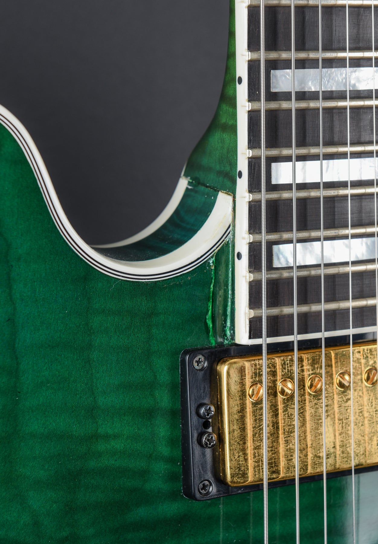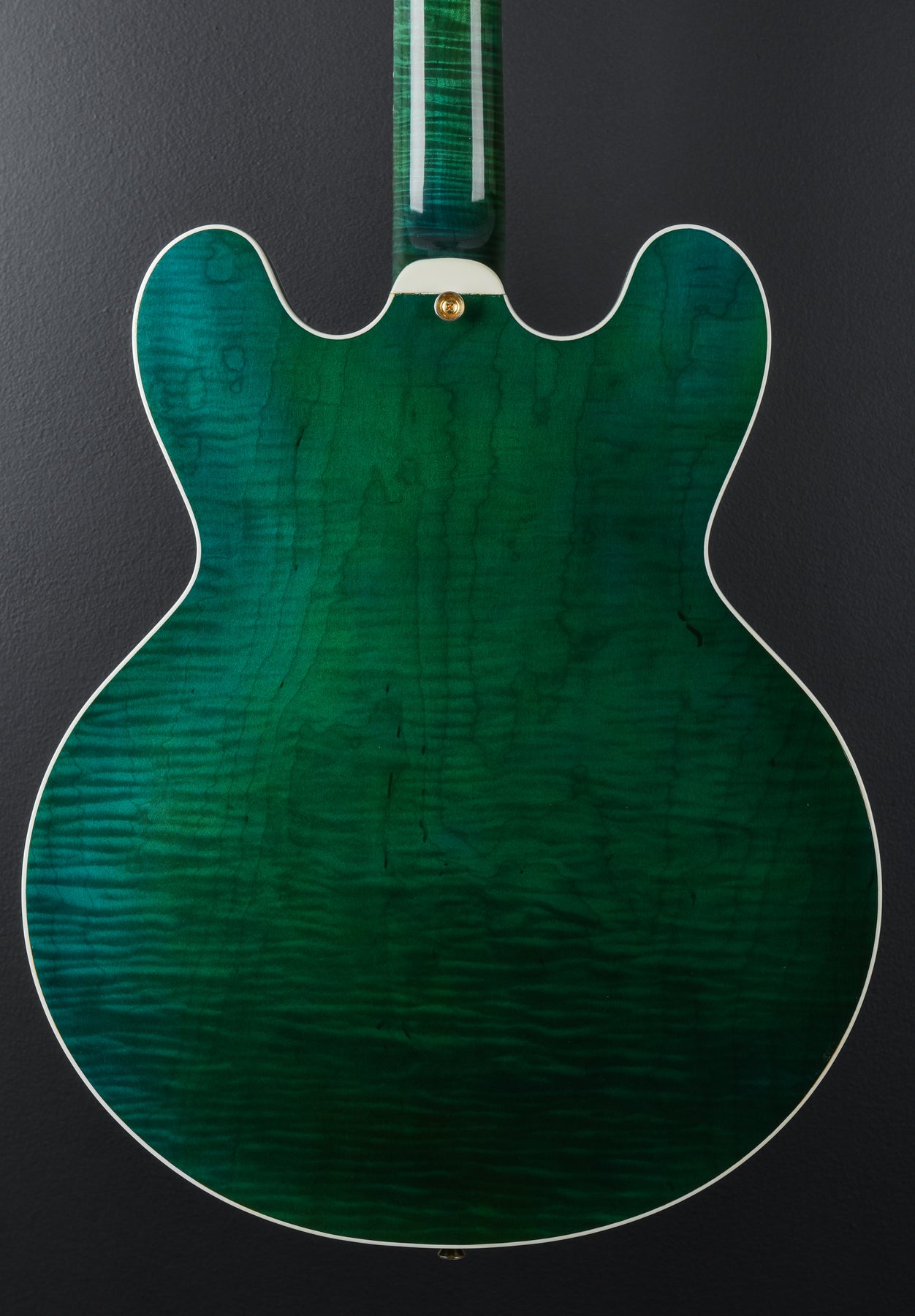 Very Good Condition, Green Emerald Translucent Finish, Semi-Hollow Body, Laminated Arched Curly Maple Top, Back, and Sides, 16" Lower Bout Width, 1.75" Rim Depth, 1-Piece Curly Maple Neck, Ebony Fingerboard with Mother of Pearl and Abalone Inlays, 22 Medium Jumbo Frets, 24.75" Scale Length, 1 11/16" Nut Width, Dual Vintage Range Alnico 5 Magnet Wax-Potted Gold-Covered Humbuckers, Gold Grover Rotomatic Tuners, Gold Plated Hardware, 7.8lbs., Comes with the Original Hardshell Case.