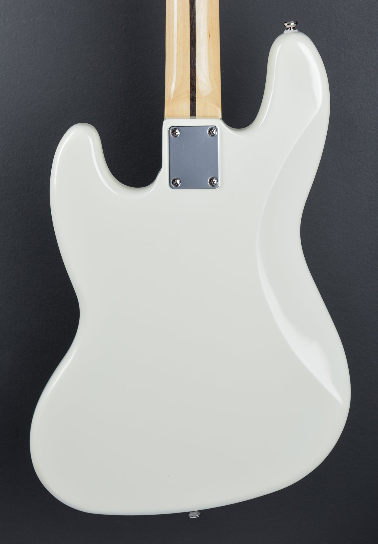 Very Good Condition, Olympic White, Squier Body, Squier Jazz Bass Pickups, Miscellaneous Maple Neck with Rosewood Fretboard, 34" Scale Length, Tortoise Shell Pickguard, Individual Volume Knobs, Master Tone, 8.6lbs., No Case or Gig Bag Included.