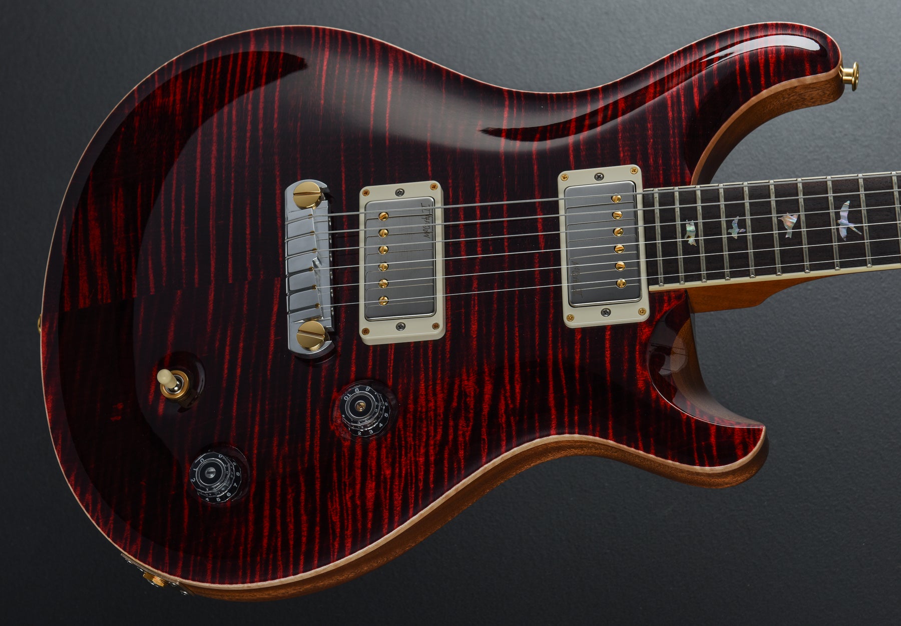 Red Tiger Wraparound Burst, High Gloss Nitro Finish, Violin Carved Flame Maple 10 Top, Mahogany Body, Pattern Carved Mahogany Neck, 10" Radius Rosewood Fingerboard with the Bird Inlays and Faux Bone Binding, 25″ Scale Length, 1 11/16th″ Nut, PRS McCarty LT Bridge and Neck Pickups, 3-Way Toggle Switching with the Volume and Push/Pull Coil Tap Tone Controls, PRS Stoptail Bridge with the Brass Inserts, PRS Vintage Style Non-Locking Tuners with the Wing Buttons, 8.1 Pounds, with Hardshell Case.