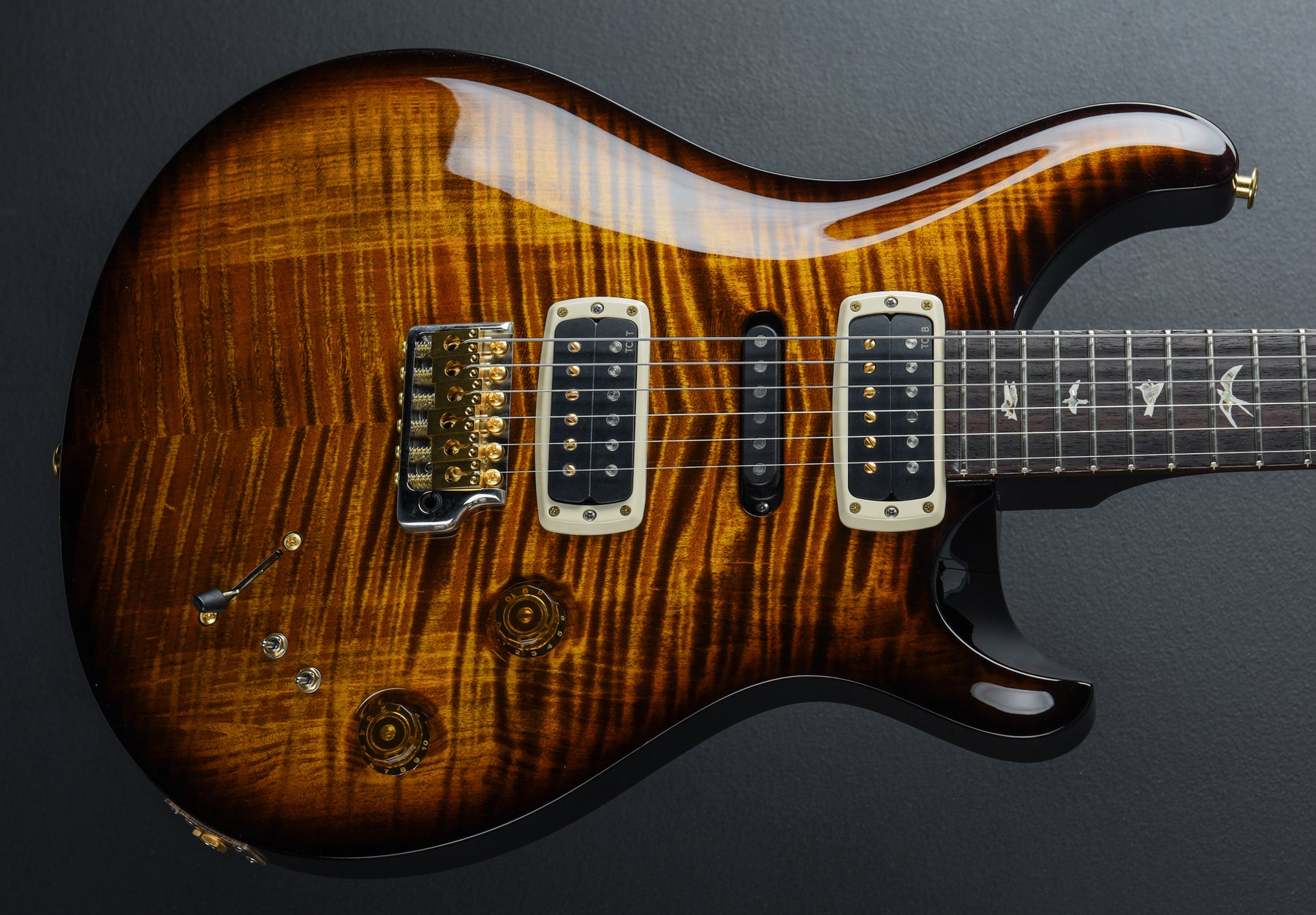 Black Gold Wraparound Burst, High gloss nitro finish, Violin carved Flame Maple 10 top, Mahogany body, Pattern carved Mahogany neck, 10" radius Rosewood fingerboard with the Bird inlays, 25″ scale length, 1 11/16th" nut, PRS TCI bridge and neck pickups plus the NS-01 middle pickup, 5-way blade switching with the volume and push/pull tone controls plus the two mini-toggle EQ switches, PRS Gen III tremolo, PRS Phase III locking tuners with the wing buttons, 8.4 pounds, With hardshell case
