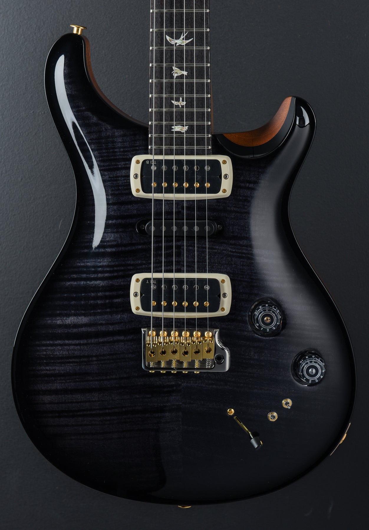 Charcoal, High gloss nitro finish, Violin carved Flame Maple 10 top, Mahogany body, Pattern carved Mahogany neck, 10" radius Rosewood fingerboard with the Bird inlays, 25″ scale length, 1 11/16th" nut, PRS TCI bridge and neck pickups plus the NS-01 middle pickup, 5-way blade switching with the volume and push/pull tone controls plus the two mini-toggle EQ switches, PRS Gen III tremolo, PRS Phase III locking tuners with the wing buttons, 7.9 pounds, With hardshell case