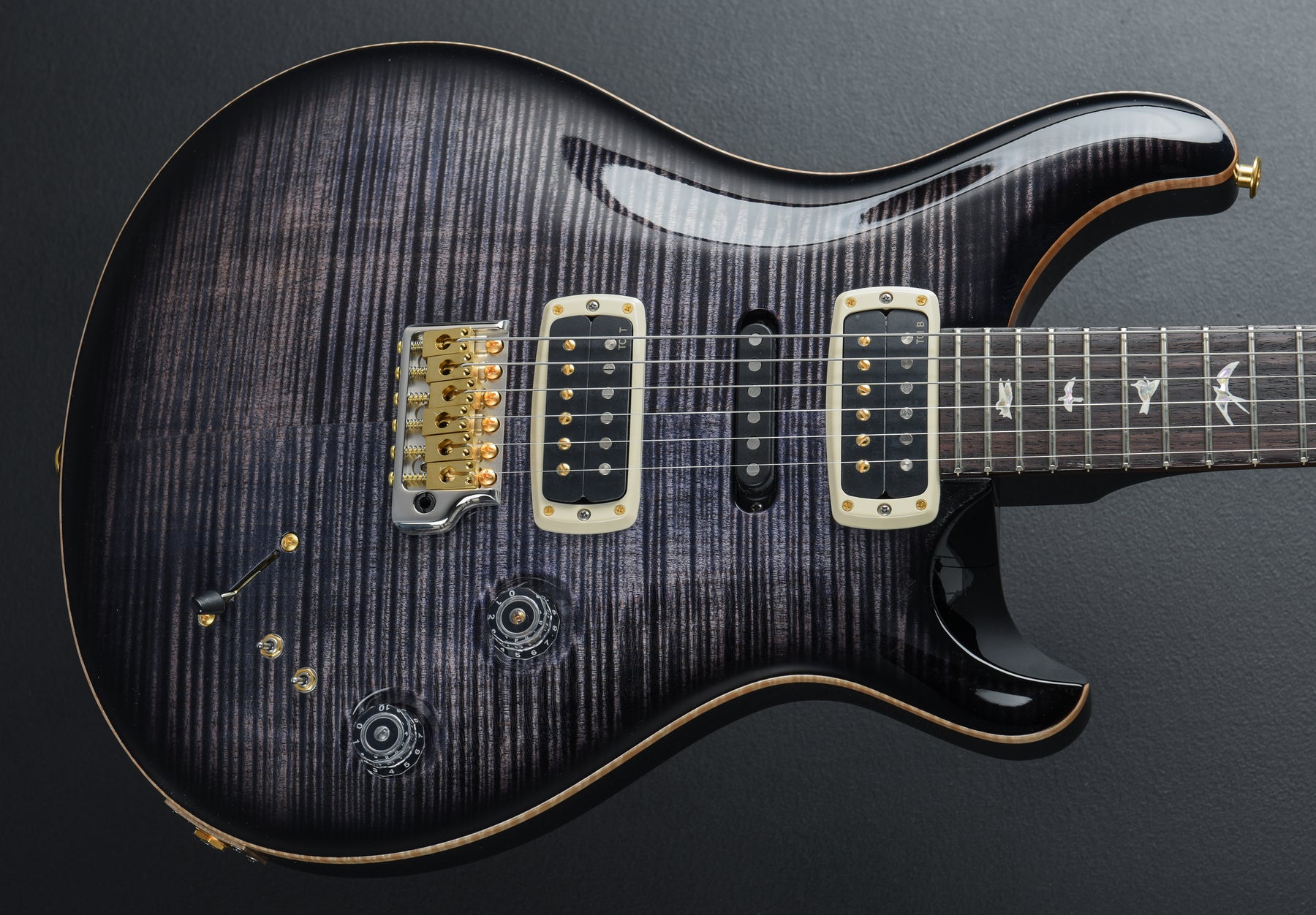 Purple Mist, High gloss nitro finish, Violin carved Flame Maple 10 top, Mahogany body, Pattern carved Mahogany neck, 10" radius Rosewood fingerboard with the Bird inlays, 25″ scale length, 1 11/16th" nut, PRS TCI bridge and neck pickups plus the NS-01 middle pickup, 5-way blade switching with the volume and push/pull tone controls plus the two mini-toggle EQ switches, PRS Gen III tremolo, PRS Phase III locking tuners with the wing buttons, 7.7 pounds, With hardshell case