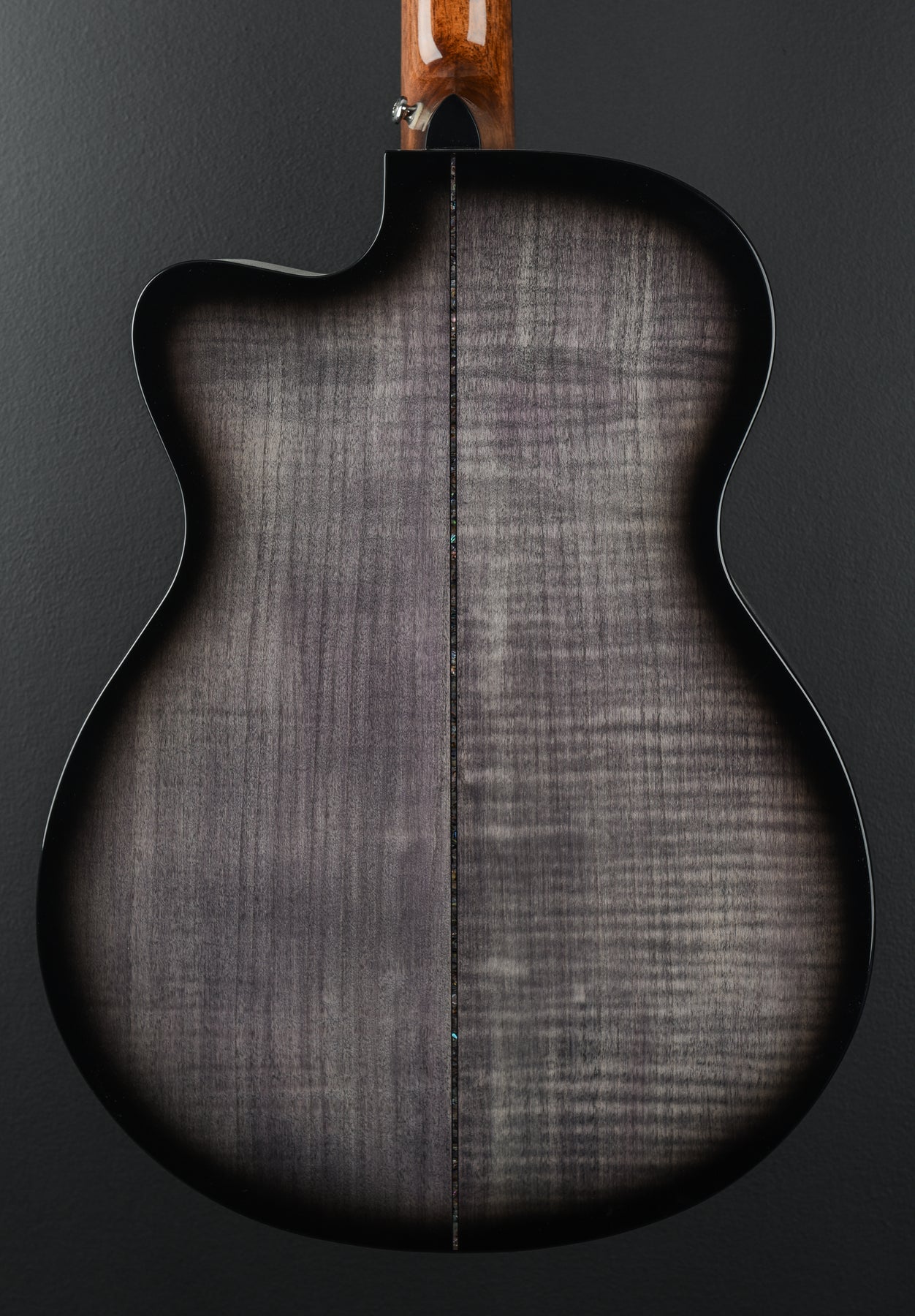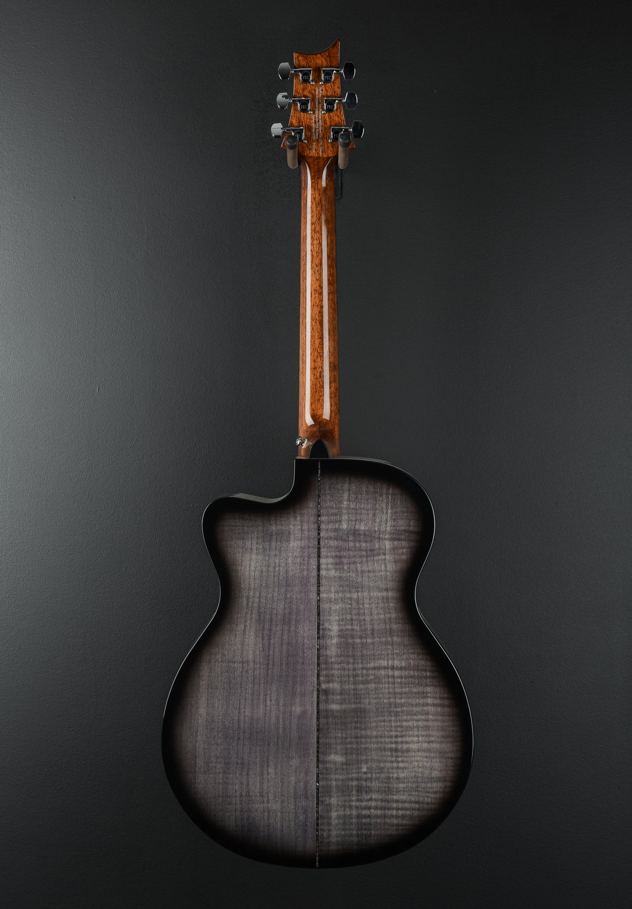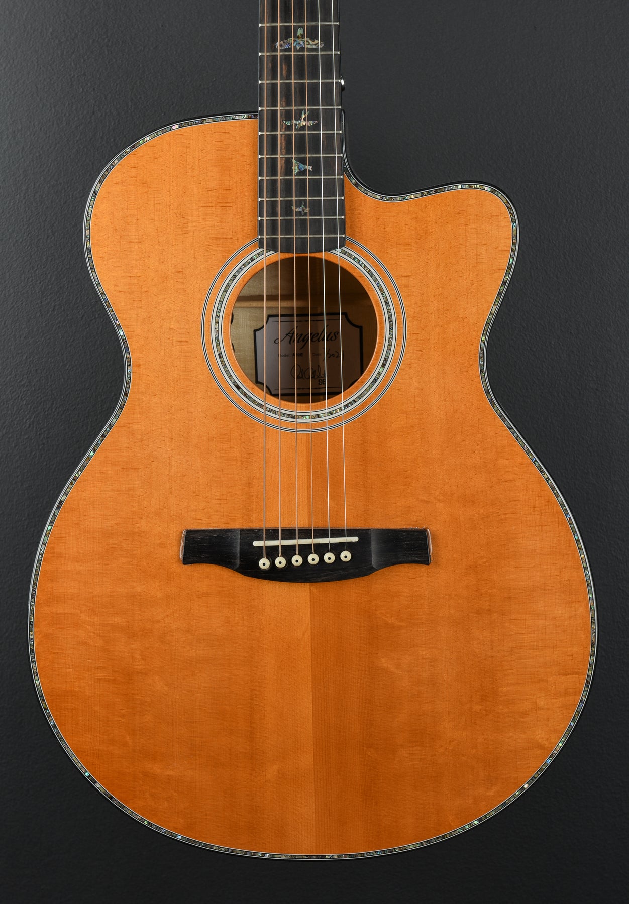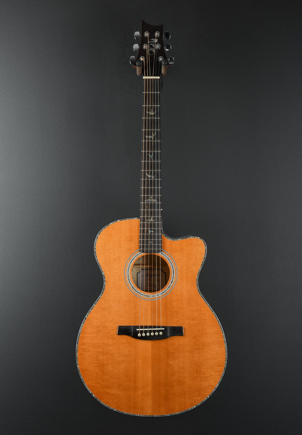 Excellent Condition, Natural w/Charcoal Burst, Angelus cutaway body shape, Solid Sitka Spruce top, PRS Hybrid “X”/Classical bracing pattern, Abalone with Black/White Rosette, Flame Maple back and sides, Black/White binding with the Abalone top purfling, Wide/Fat shaped Mahogany neck with a 11.81″ radius Ebony fingerboard and the Bird inlays, 25.3″ scale length, 1 11/16th” wide bone nut, PRS cast/sealed tuners, With the factory Fishman GT1 pickup system