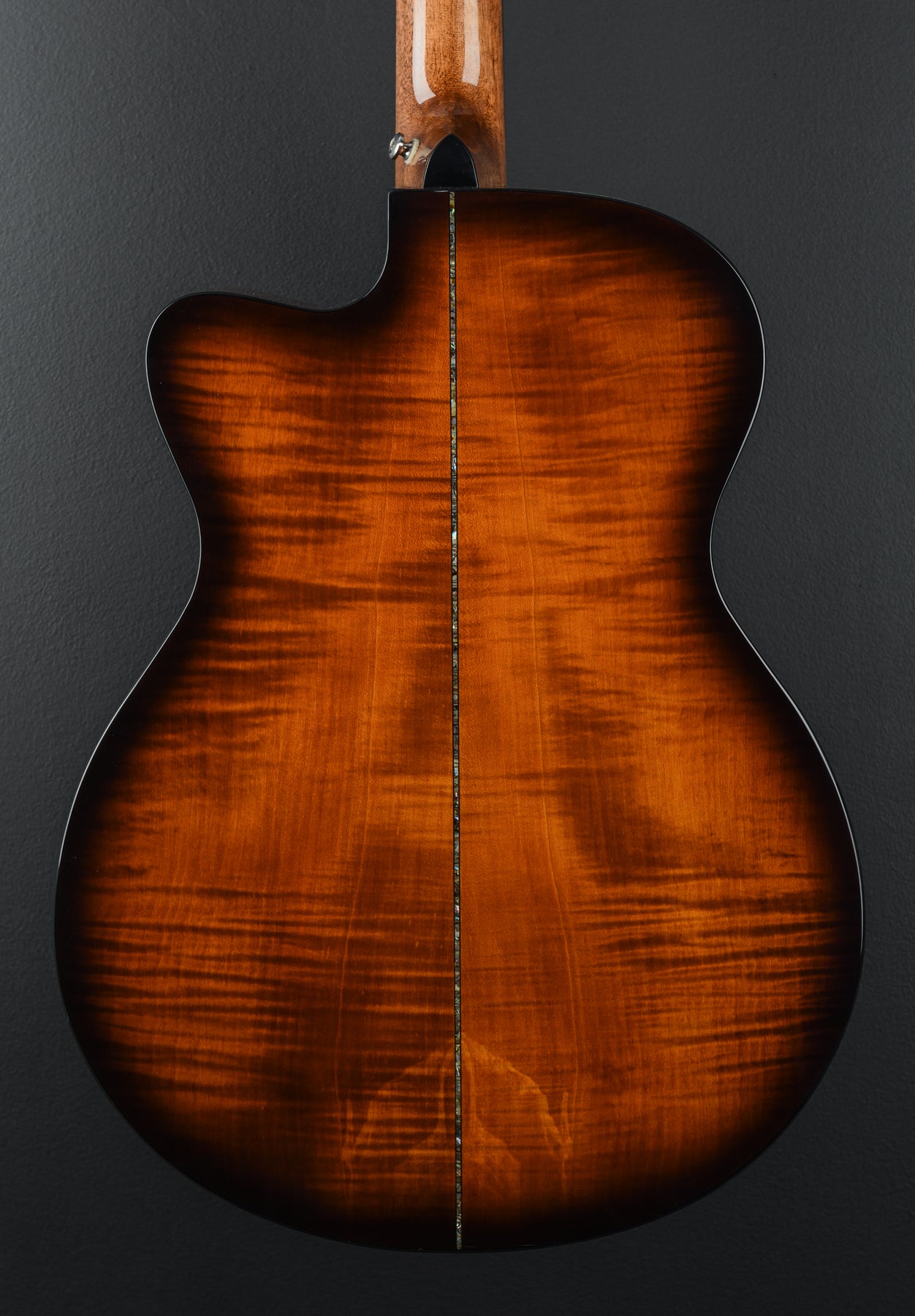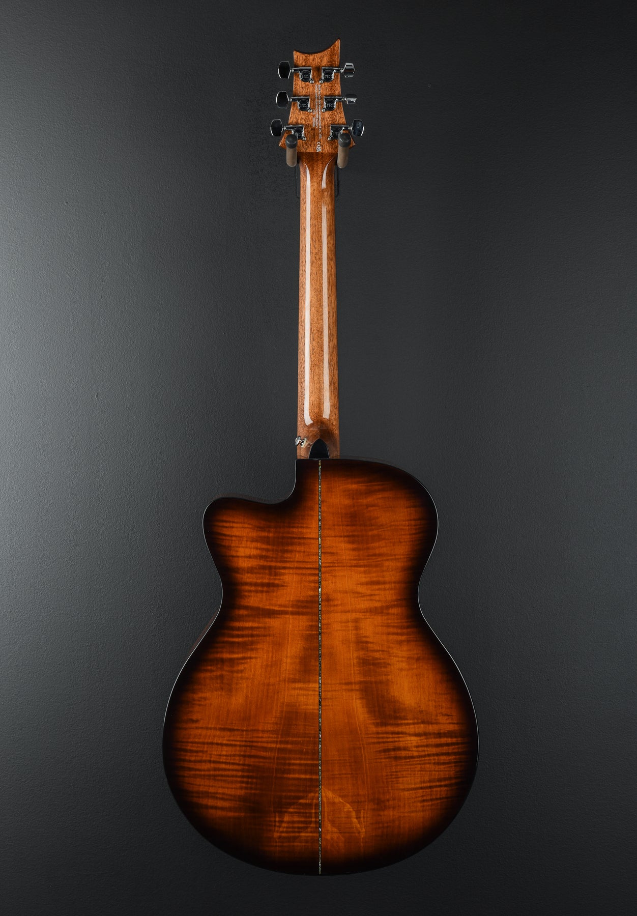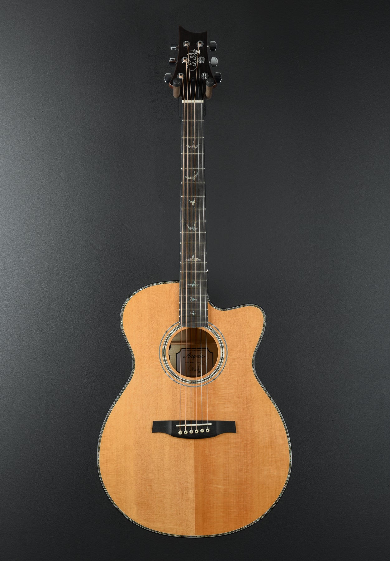 Very Good Condition, Natural w/Black Gold Burst, Angelus cutaway body shape, Solid Sitka Spruce top, PRS Hybrid “X”/Classical bracing pattern, Abalone with Black/White Rosette, Flame Maple back and sides, Black/White binding with the Abalone top purfling, 11.81″ radius Ebony fingerboard with Bird inlays on a Wide/Fat shaped Mahogany neck, 25.3″ scale length, 1 11/16th” wide bone nut, With the factory Fishman GT1 pickup system and hardshell case.