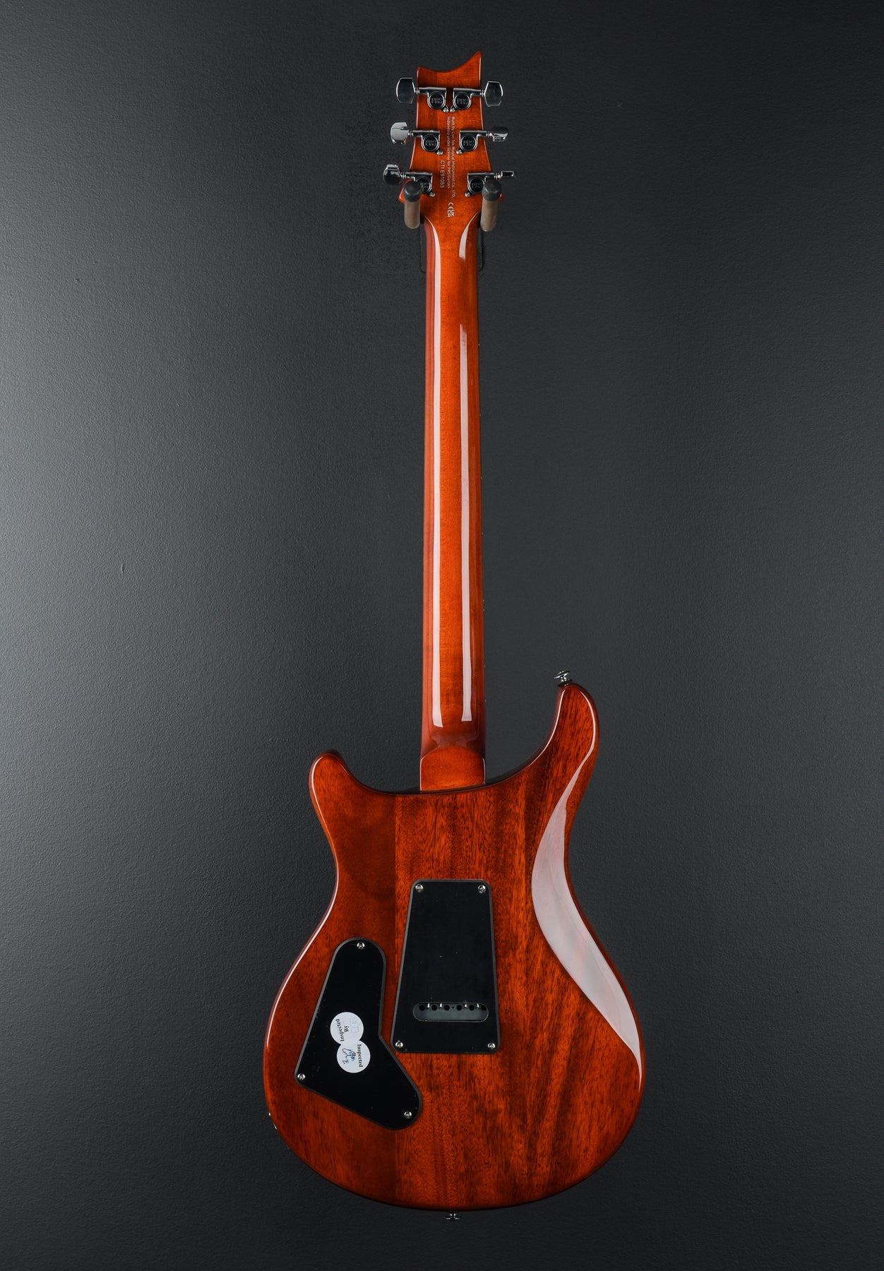 Very Good Condition, Vintage Sunburst, Shallow Violin carved Maple top with a Flame Maple veneer, Mahogany body, Wide/Thin carved Maple neck, 10″ radius Rosewood fingerboard with the Bird inlays, 25″ scale length, 1 11/16th″ nut width, TCI "S" bridge and Blackfire Proteus neck pickups, 3-way toggle switching with the volume and tone controls plus the two mini-toggle coil tap switches, PRS patented molded tremolo and PRS designed tuners, 7.7 pounds, comes with gig bag.