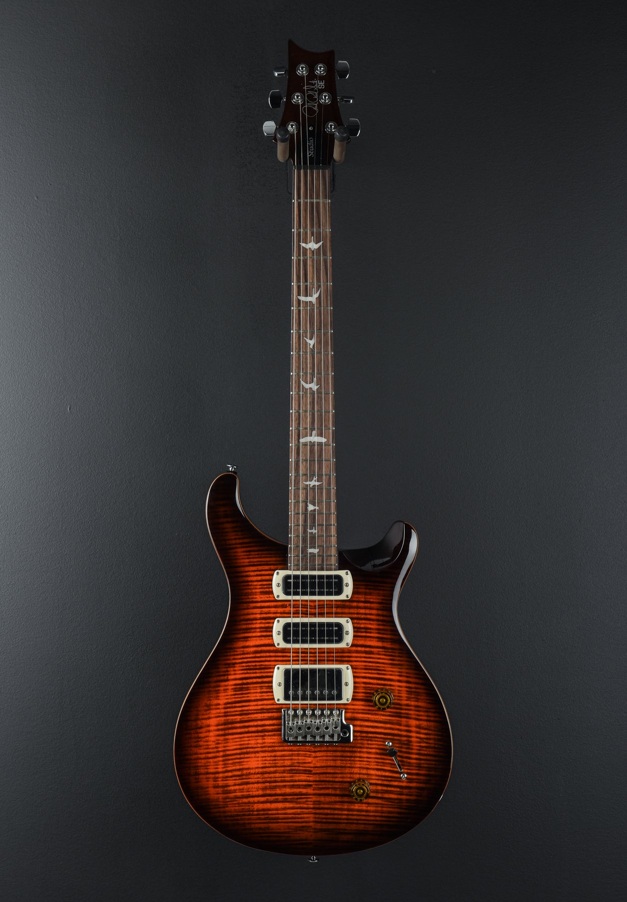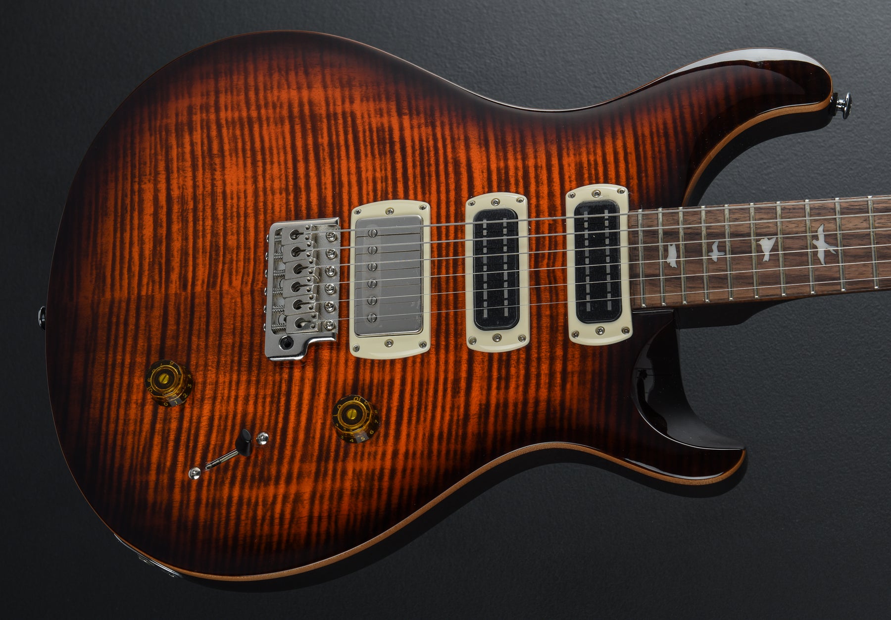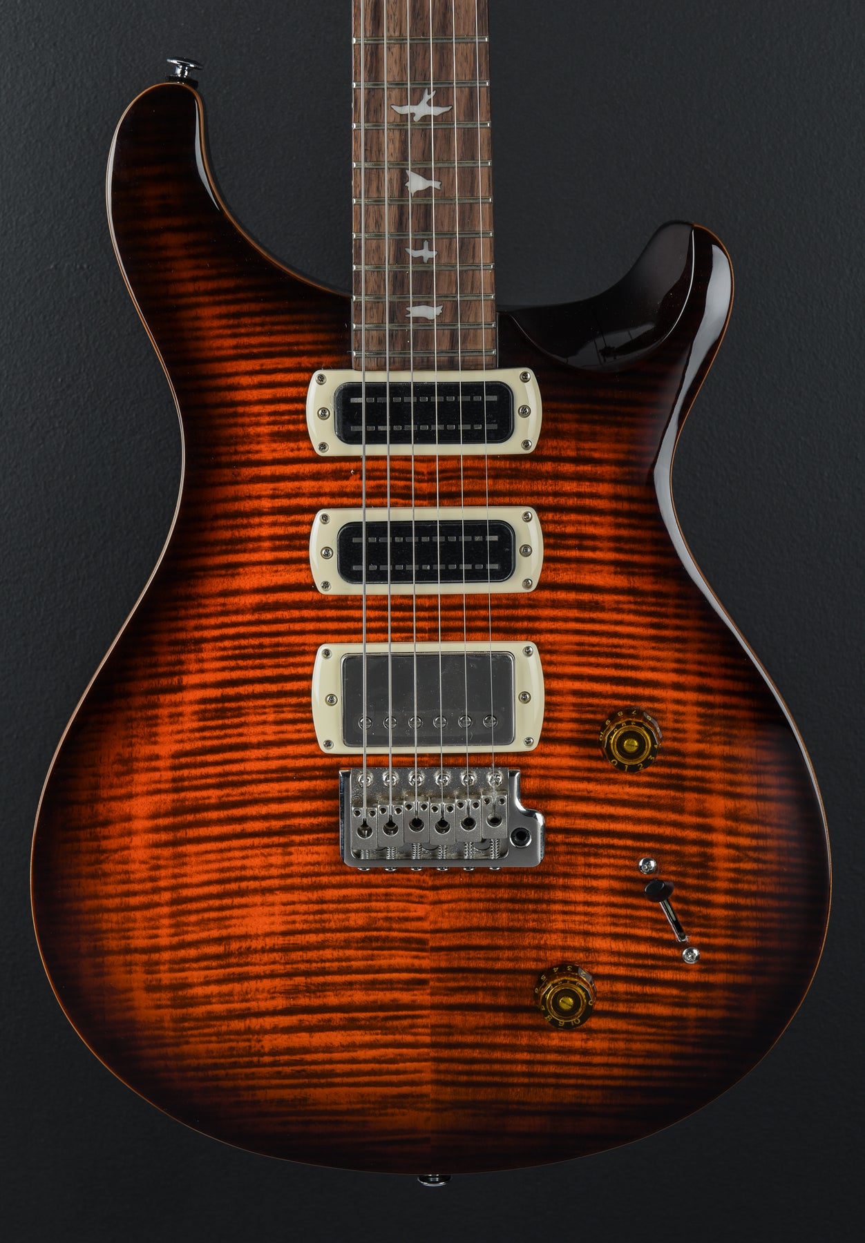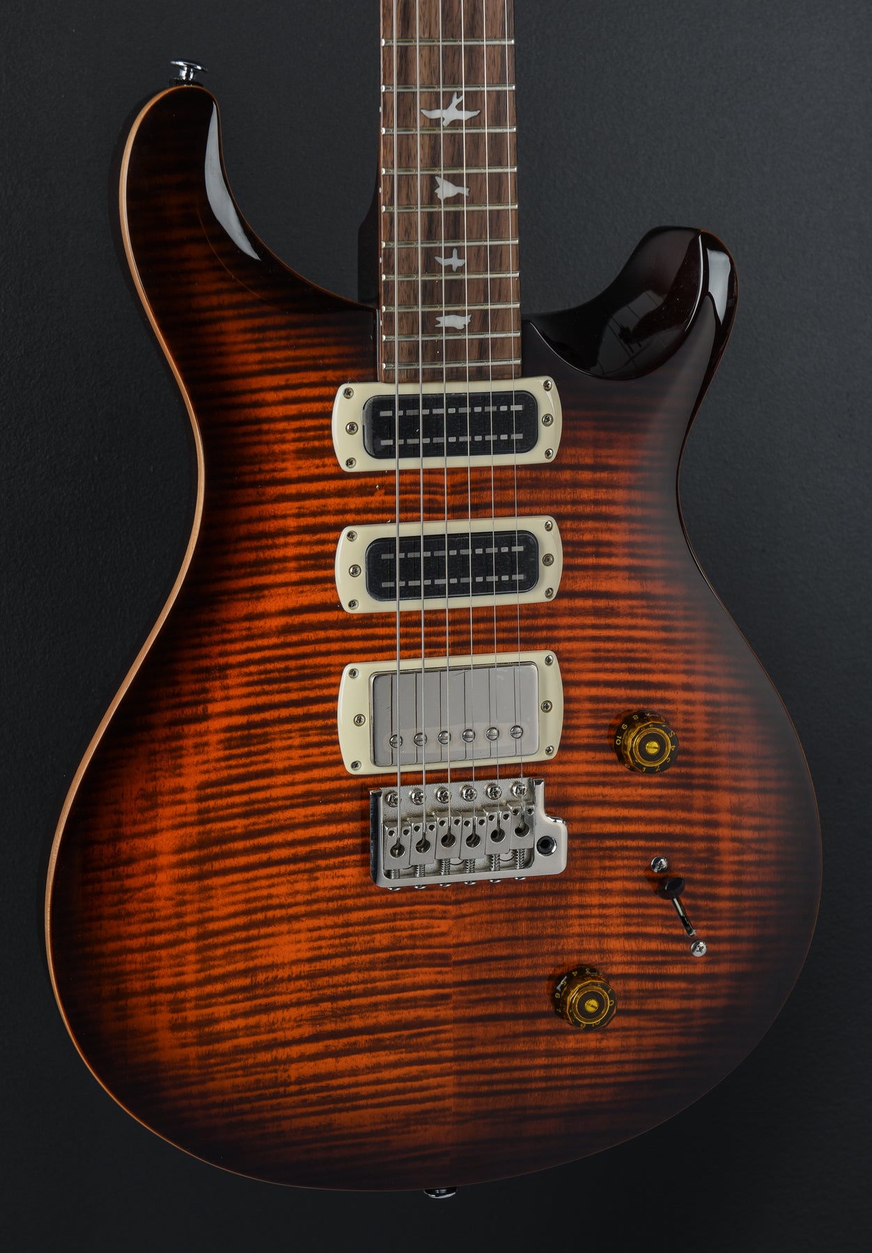 Very Good Condition, Orange Tiger Smokeburst, Mahogany Body, Shallow Violin Carved Maple Cap with a Figured Maple Veneer, 10" Radius Rosewood Fingerboard with Bird Inlays on a Wide Thin Carved Maple Neck, 1 11/16" Nut Width, 25" Scale Length, 58/15 “S” Bridge and Narrowfield DD “S” Neck/Middle Pickups, 5-Way Switching with Volume and Push/Pull Coil Tap Tone Controls, PRS Patented Tremolo and PRS Designed Tuners, 7.8 Pounds, Comes with Gig Bag.