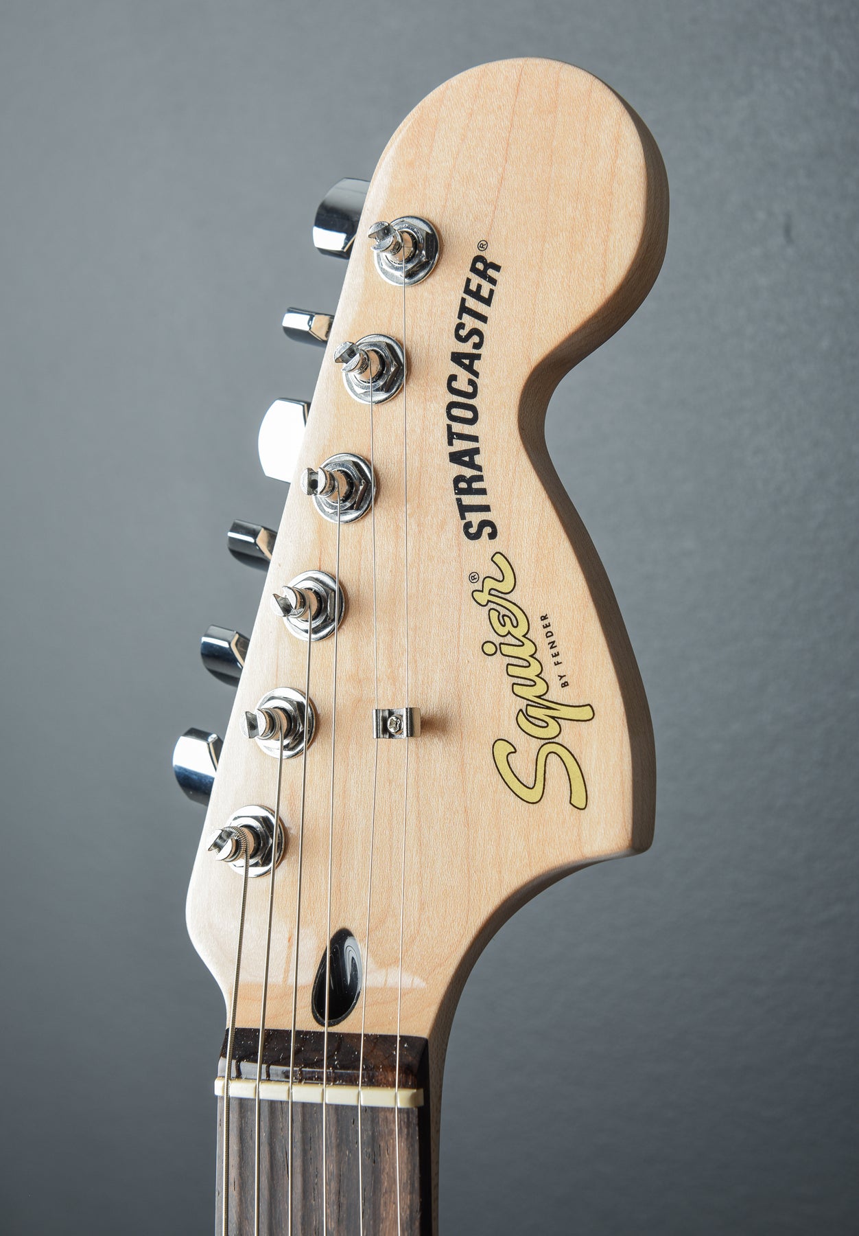 "A superb gateway into the time-honored Fender® family, the Squier® Affinity Series® Stratocaster® delivers legendary design and quintessential tone for today's aspiring guitar hero. This Strat® features several player-friendly refinements such as a thin and lightweight body, a slim and comfortable "C"-shaped neck profile, a 2-point tremolo bridge for superior tremolo action and sealed die-cast tuning machines with split shafts for smooth, accurate tuning and easy restringing. Loaded with a trio of Squier single-coil Strat pickups with 5-way switching for genre-defying sonic variety, this model is ready to accompany any player at any stage."