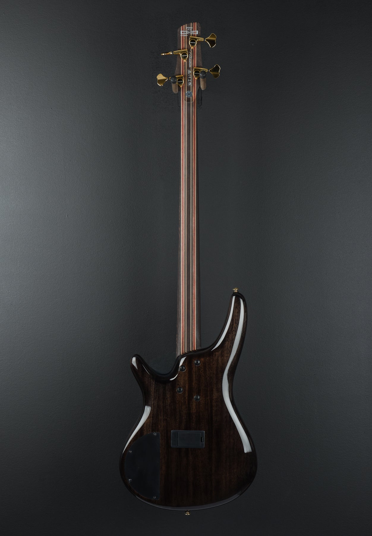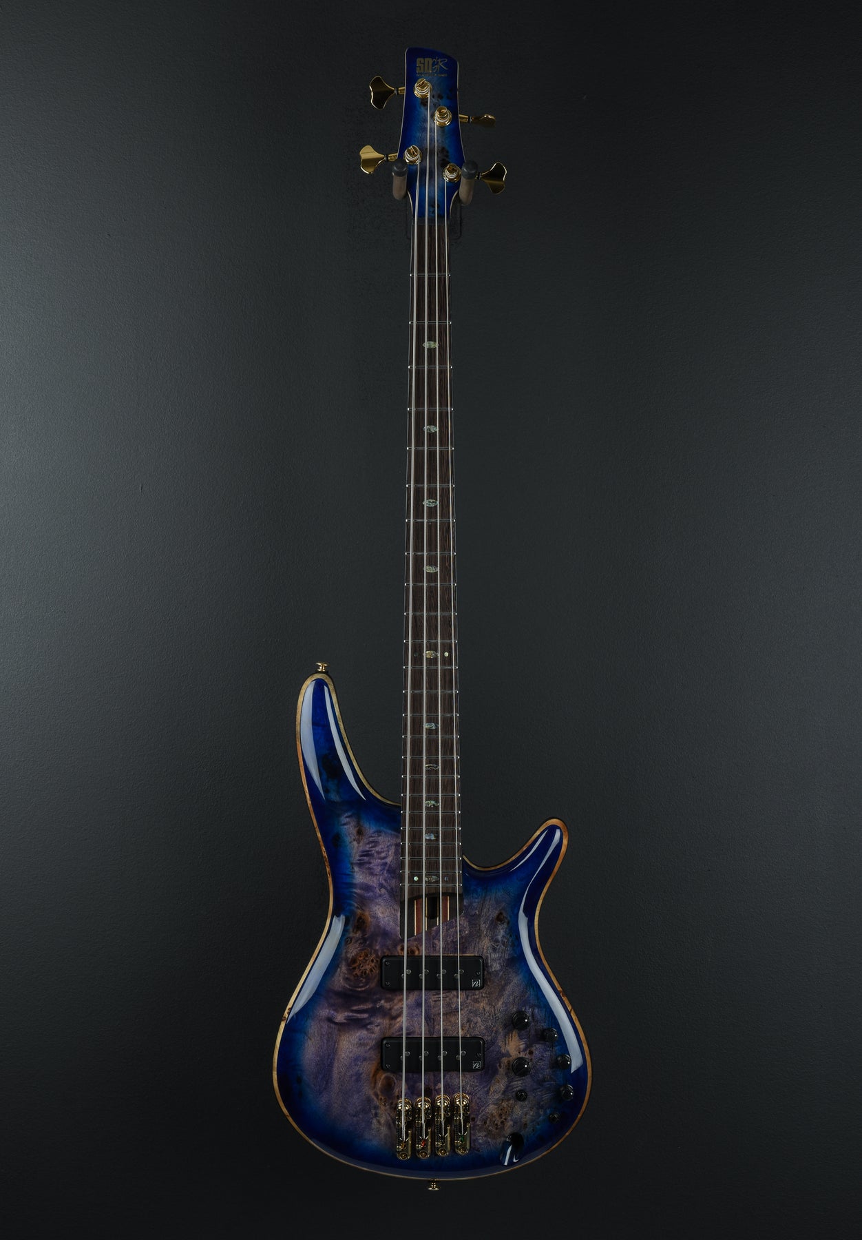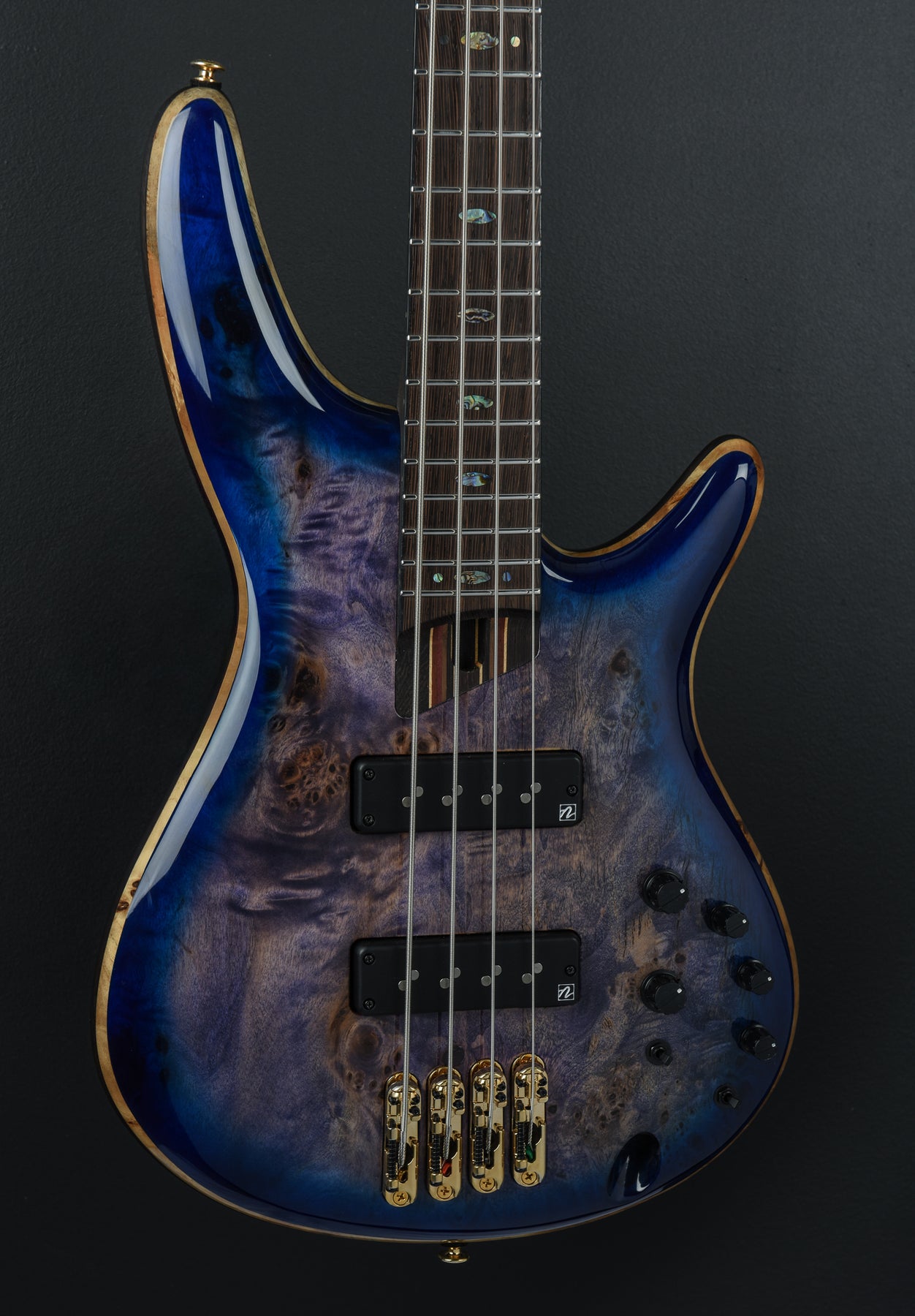 Cerulean Blue Burst, Poplar Burl top, African Mahogany body, Atlas 4 shaped 15 piece Panga Panga/Maple/Paduak/Purpleheart/Walnut neck with the KTS titanium truss rods, Bound 12″ radius Panga Panga fingerboard with the Abalone Oval inlays and medium stainless steel frets, 34″ scale length, 1.5″ nut width, Nordstrand Big Single bridge and neck pickups, Ibanez custom 3-band EQ w/EQ bypass switch (passive tone control on treble pot) and a 3-way mid frequency switch, MR5S bridge and Gotoh cast/sealed tuners, 7.9 pounds, With gig bag