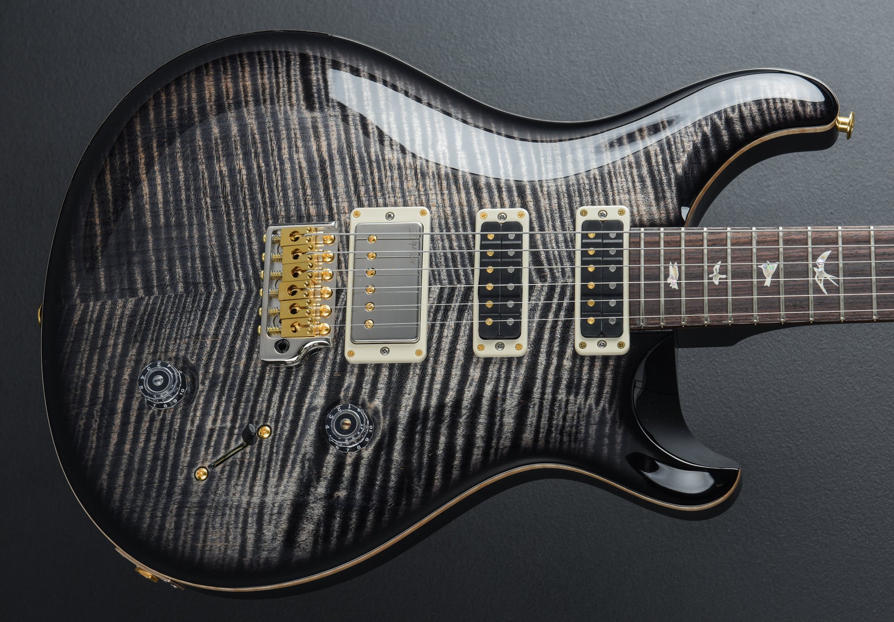 Charcoal Burst, High gloss nitro finish, Violin carved Flame Maple 10 top, Mahogany body, Pattern carved Mahogany neck, 10" radius Rosewood fingerboard with the Bird inlays, 25″ scale length, 1 11/16th" nut, PRS McCarty III bridge and PRS Narrowfield middle/neck pickups, 5-way blade switching with the volume and push/pull coil tap tone controls, PRS Gen III tremolo, PRS Phase III locking tuners with the wing buttons, 7.9 pounds, With hardshell case