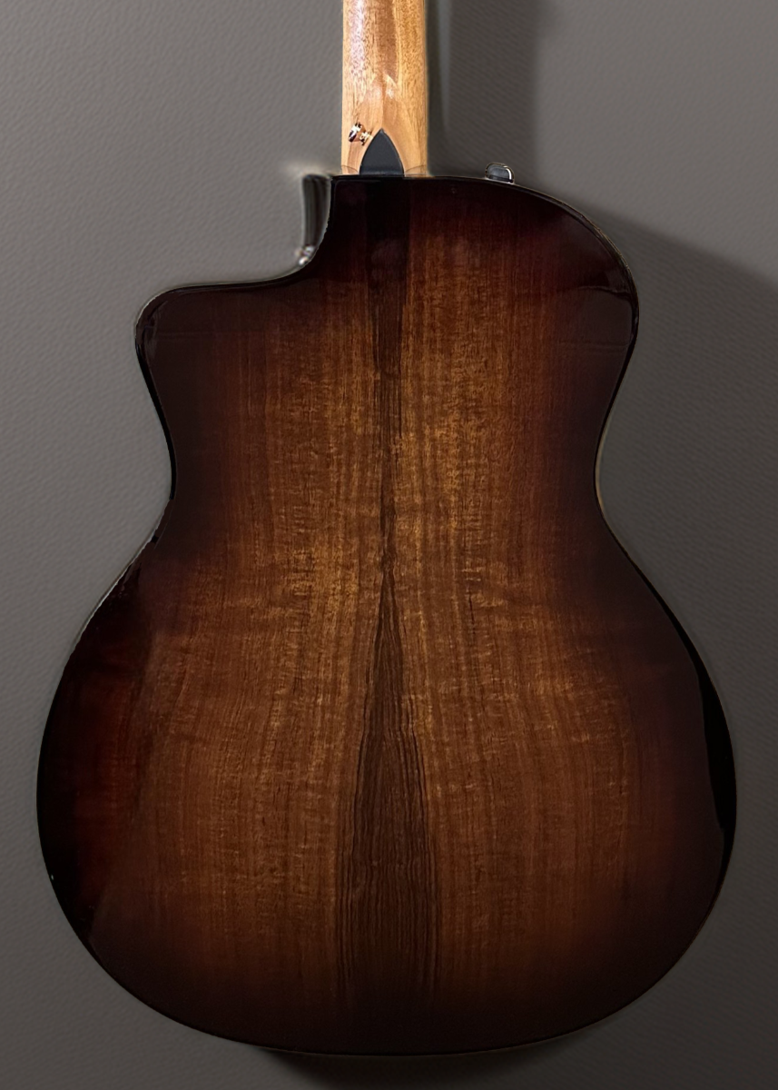 Excellent Condition, Shaded Edge Burst, Gloss top and body finish, Grand Auditorium body shape with the venetian cutaway, Hawaiian Koa top, Single Ring Faux Pearl Rosette, C-Class Bracing with Relief Rout, Layered Hawaiian Koa back and sides, Black binding, West African Crelicam Ebony fingerboard on a Tropical Mahogany neck, 25.5” scale length, 1 11/16th” nut width, Cast/sealed tuners, With the Expression 2 pickup system and Taylor hardshell case.