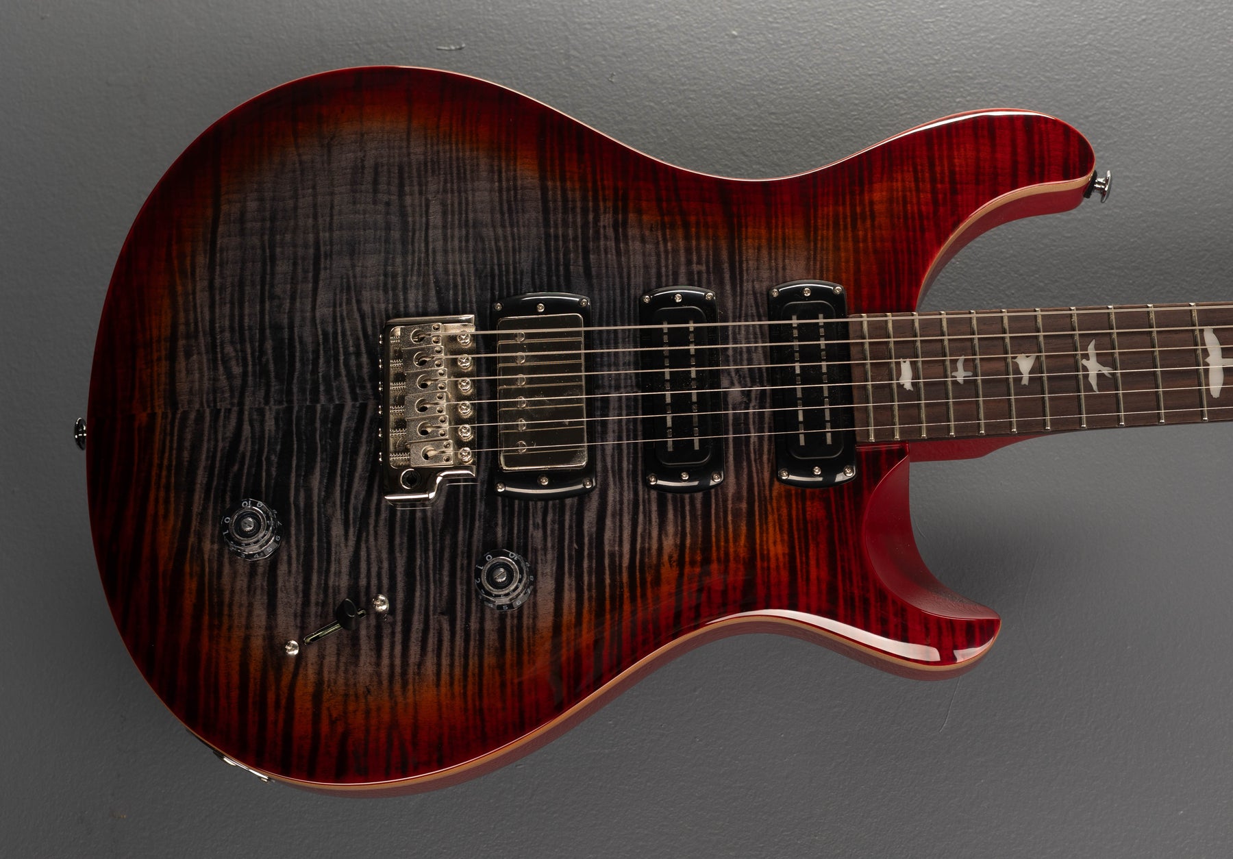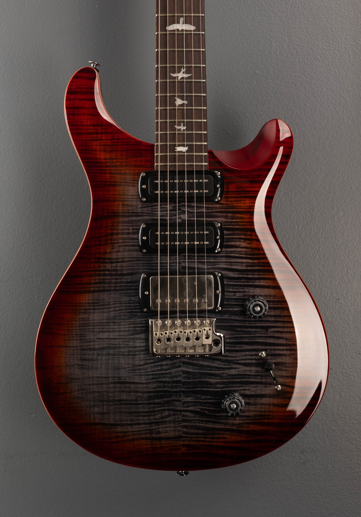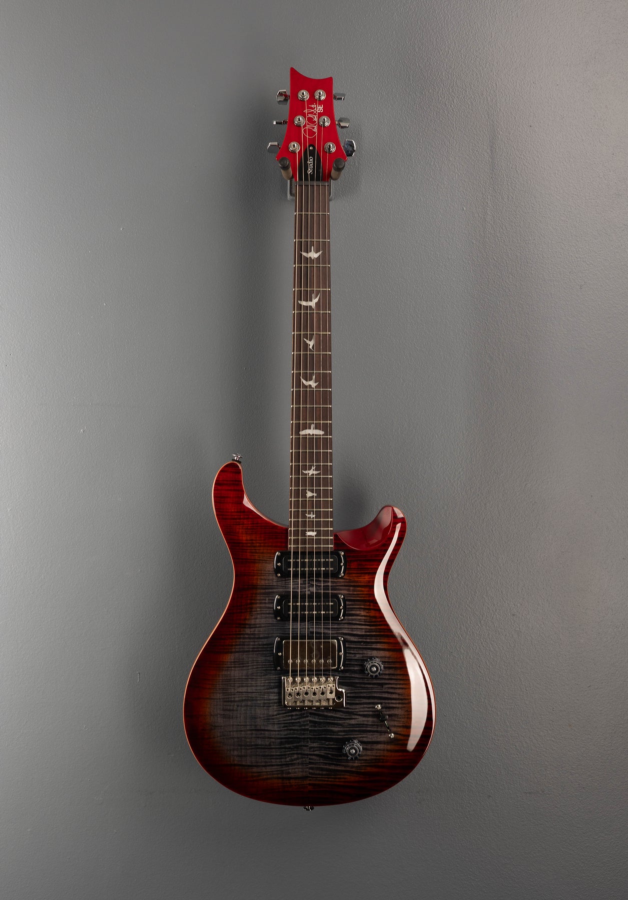 Excellent Condition, Charcoal Cherry Burst, Mahogany body, Shallow Violin Carved Maple cap with a Figured Maple veneer, 10" radius Rosewood fingerboard with bird inlays on a Wide Thin carved Maple neck, 1 11/16" nut width, 25" scale length, 58/15 “S” bridge and Narrowfield DD “S” Neck/Middle pickups, 5 way switching with volume and push pull coil tap tone controls, PRS Patented Tremolo and PRS Designed Tuners, 8.0 pounds, comes with gig bag.