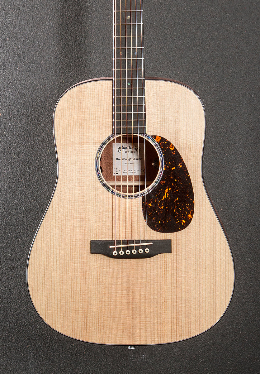 Natural, Satin top and body finish, D Junior 14-Fret body shape, Spruce top, Single Ring faux Abalone Rosette, Scalloped X bracing, Sapele back and sides, Black binding with the multi-stripe top inlay, Performing Artist w/high performance taper shaped select hardwood neck, FSC certified Richlite fingerboard with the faux Abalone Style 28 position markers, 24.9” scale length, 1 3/4” nut width, Cast/sealed tuners, With the Martin E1 pickup system and softshell case
