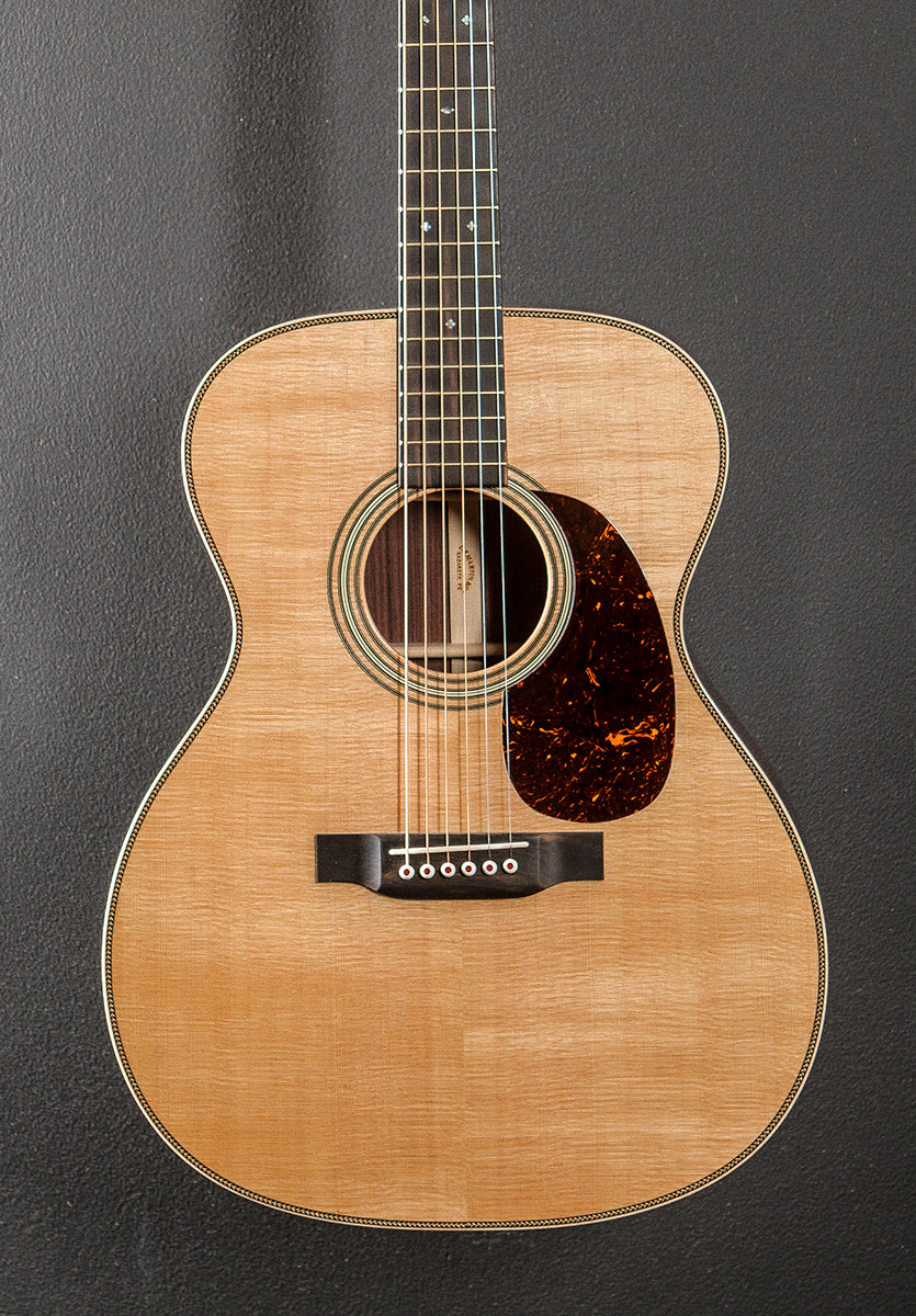 Natural, 000-14 Fret body shape, Solid Sitka Spruce top w/VTS, Adirondack Spruce scalloped X bracing w/VTS, Style 28 multi-stripe Rosette, European Flame Maple binding with the Bold Herringbone top and multi-stripe back inlay, East Indian Rosewood back and sides, Zig-Zag Authentic back purfling, Ebony fingerboard with the Abalone long pattern Diamond and Squares position markers on a vintage deluxe w/high performance taper shaped Mahogany neck, 24.9″ scale length, 1 3/4” nut width, Waverly tuners, With hardshell case
