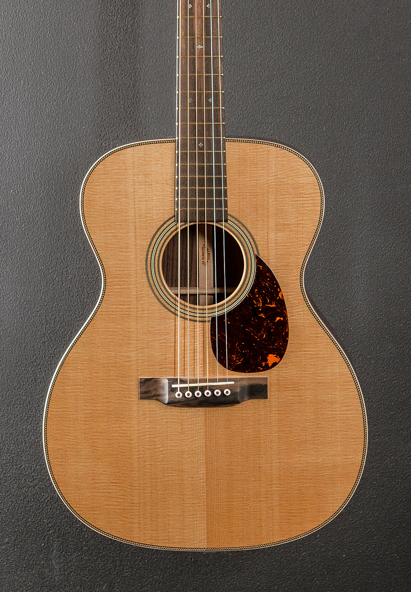 Natural, 000-14 Fret body shape, Solid Sitka Spruce top w/VTS, Adirondack Spruce w/VTS scalloped X bracing, Style 28 multi-stripe Rosette, European Flame Maple binding with the Bold Herringbone top and multi-stripe back inlay, East Indian Rosewood back and sides, Zig-Zag Authentic back purfling, Ebony fingerboard with the Abalone long pattern Diamond and Squares position markers on a vintage deluxe w/standard taper shaped Mahogany neck, 25.4″ scale length, 1 3/4” nut width, Waverly tuners, With hardshell case
