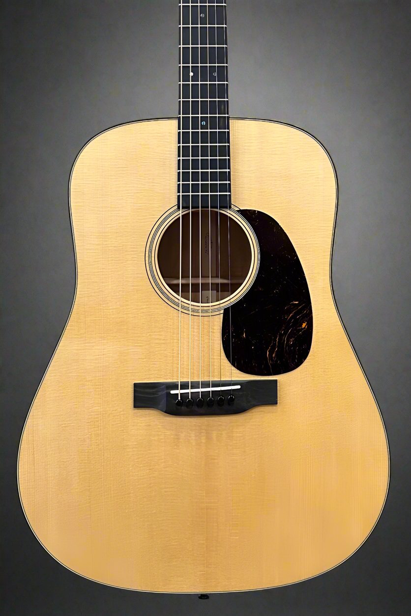 Natural, Satin finish, D-14 Fret body shape, Spruce top, Forward shifted scalloped X bracing, Multi-stripe Rosette, Mahogany back and sides, Black binding with the multi-stripe top inlay, Style 18 back purfling, Ebony fingerboard with the Abalone Old Style 18 position markers on a modified low oval w/high performance taper shaped Mahogany neck, 25.4" scale length, 1 3/4” nut width, Grover open gear tuners, With hardshell case