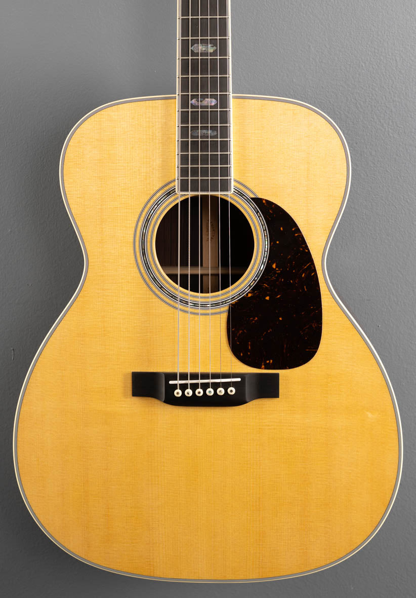 Natural, J-14 Fret body shape, Solid Spruce top, Scalloped forward shifted X bracing, Abalone with multi-stripe Rosette, Antique White binding with the multi-stripe top/back/side inlay, East Indian Rosewood back and sides, Style 45 back purfling, Ebony fingerboard with the Abalone Reduced Hexagon position markers on a modified low oval w/high performance taper shaped Mahogany neck, 25.4″ scale length, 1 3/4” nut width, With hardshell case