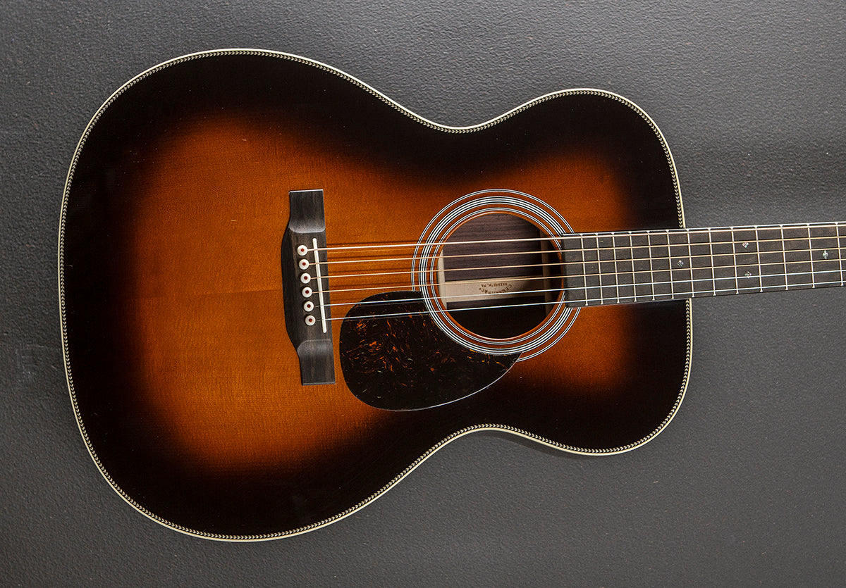 1935 Sunburst, Gloss top and body finish, 000-14 Fret body shape, Solid Sitka Spruce top, Golden Era Scalloped X bracing, Multi-stripe Rosette, Antique White binding with the Bold Herringbone top and multi-stripe back inlay, East Indian Rosewood back and sides, Style 28 back purfling, Golden Era modified low oval w/high performance taper shaped select hardwood neck, Ebony fingerboard with the Abalone long Diamond and Squares position markers, 25.4” scale length, 1 3/4” nut width, Grover open gear tuners, With hardshell case case
