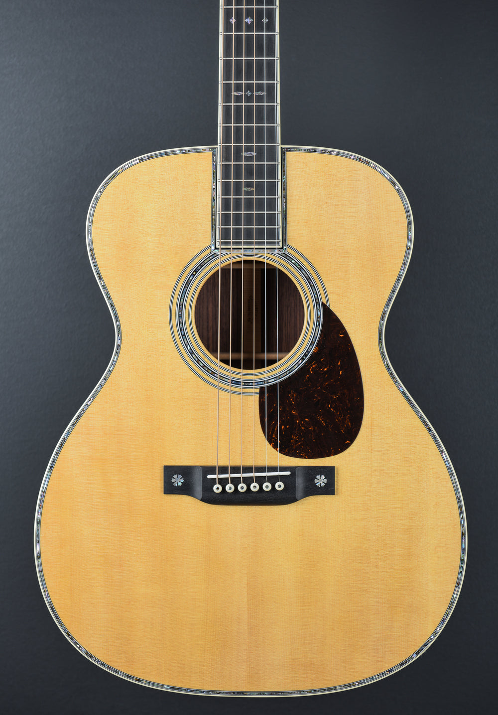 Natural, 000-14 Fret body shape, Solid Sitka Spruce top, Scalloped X bracing, Abalone with the multi-stripe Rosette, Solid East Indian Rosewood back and sides, Style 45 back purfling, Grained Ivoroid binding with the Abalone w/multi-stripe top inlay, Multi-stripe back and side inlay, Ebony fingerboard with the Abalone Style 45 Snowflake position markers on a modified low oval w/high performance taper shaped Mahogany neck, 25.4” scale length, 1 3/4" nut width, With hardshell case