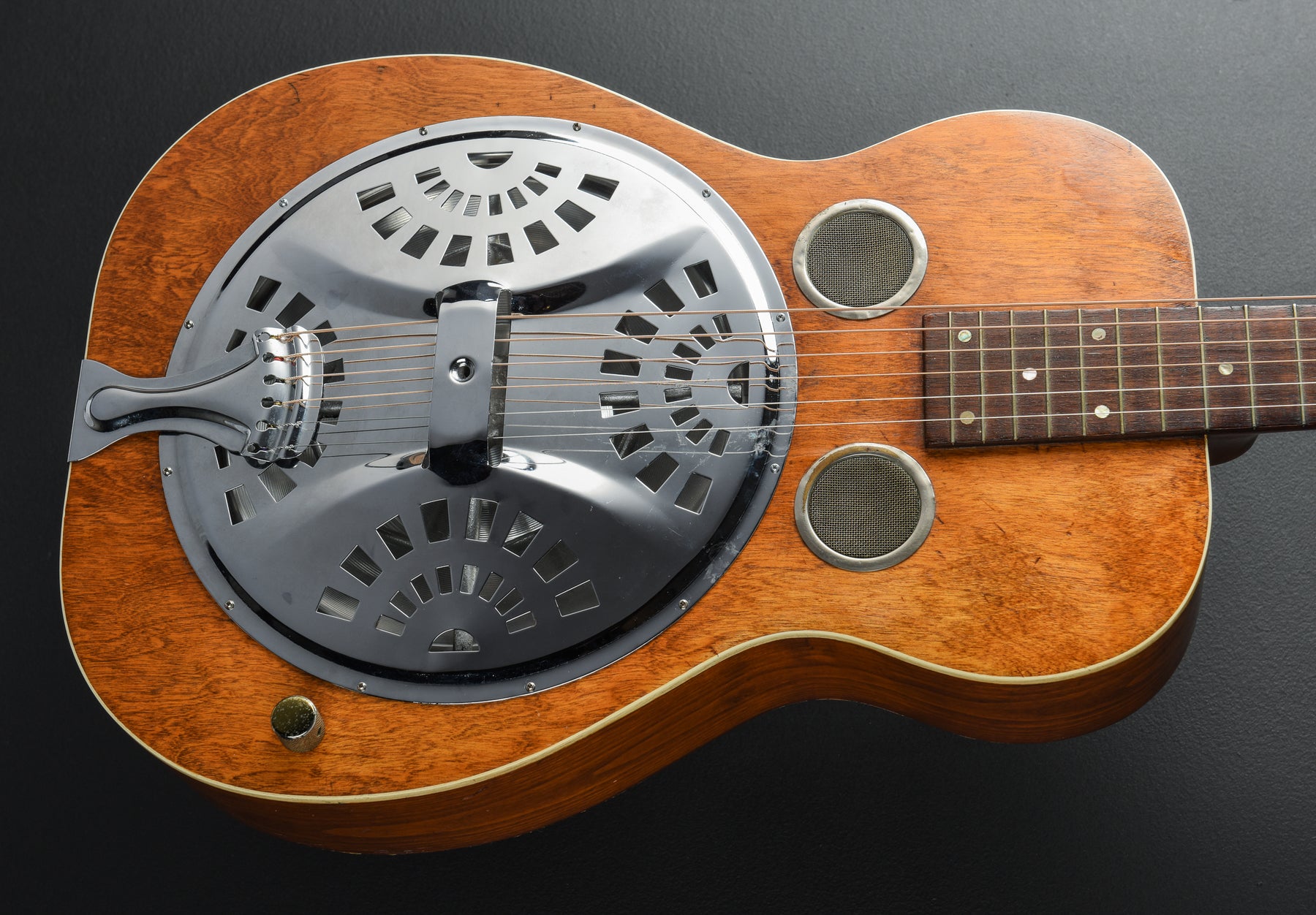Good Condition, Made in California, Laminated Birch Top, Back, and Sides, Mahogany Neck with a Rosewood Fretboard, Round Neck with Bone High Nut, 25" Scale Length, Maple with Ebony Capped Bridge Saddles, Paul Beard Legend Cone, Classical-Style Headstock with Non-Original Strip Tuners, Dobro Brand #14 Spider Bridge, Original Screens, Aftermarket Cover Plate and Tailpiece, Comes with a Soft Case.