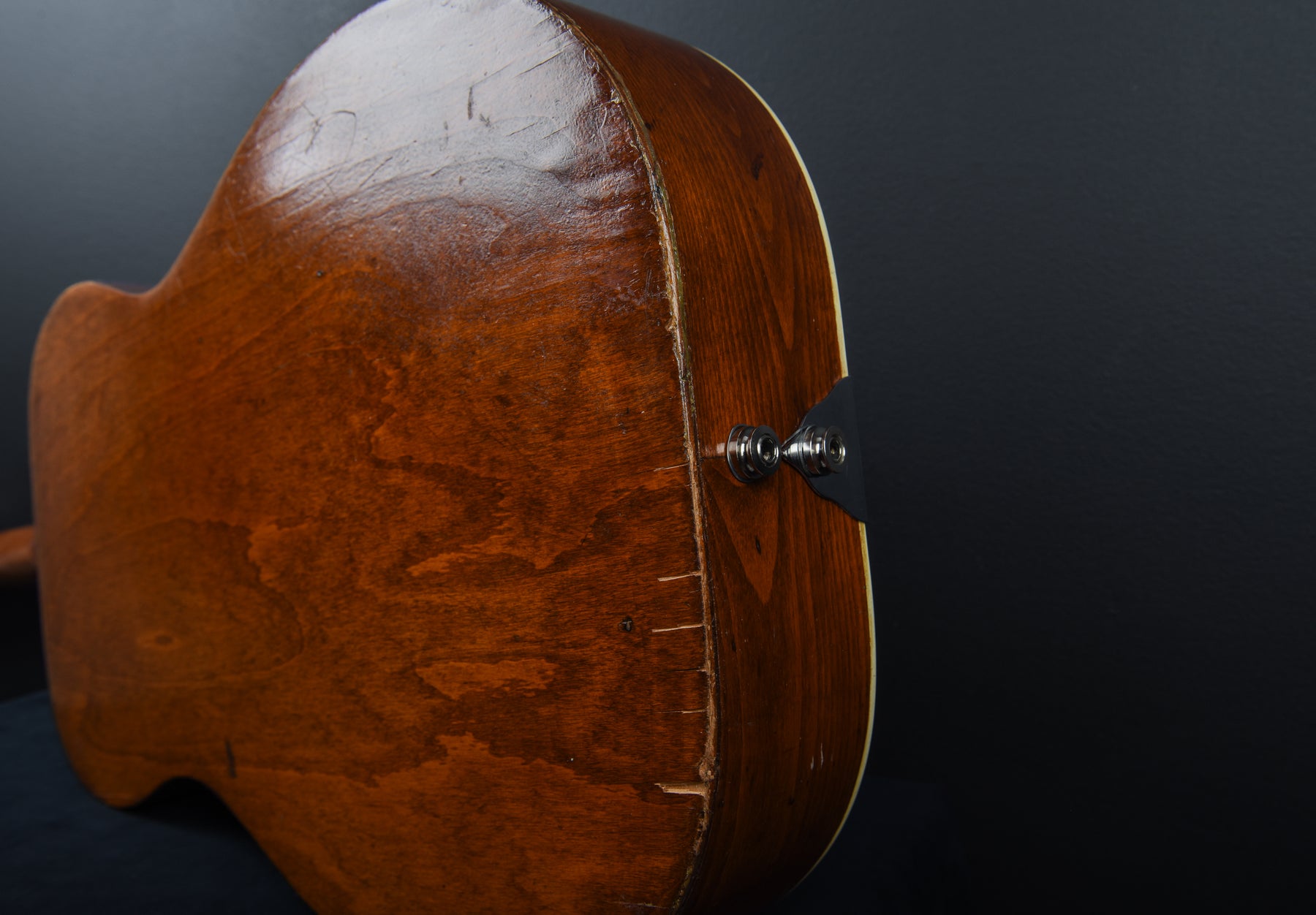 *Please Note: There has been water damage repaired on the bottom near the strap button. There are two inactive output jacks and a volume knob. It was also stripped and refinished in polyurethane. Please refer to the photos.*