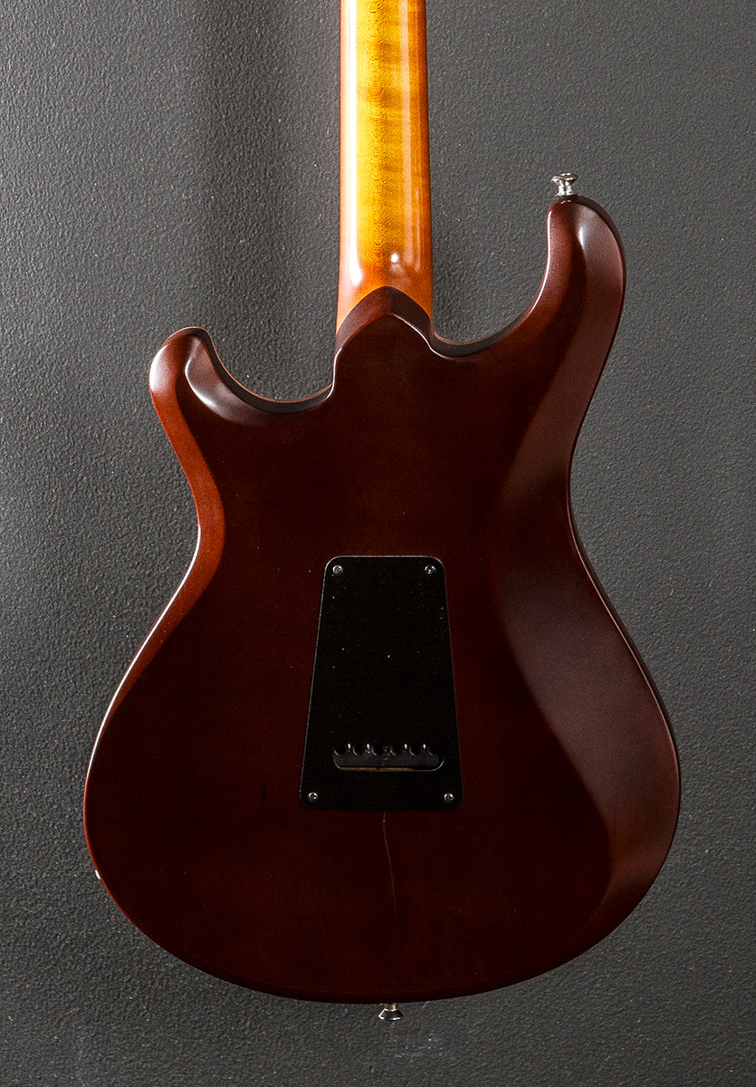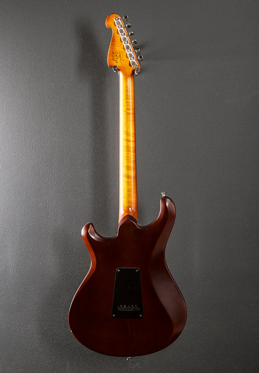 Natural, L.M. number 54, Semi-gloss finish, Spalted Maple top on an Alder body, Knaggs slight V to C shaped T2 curly Rock Maple neck, 8.5" radius T2 curly Rock Maple fingerboard with the Larry Mitchell/Diamond inlays and low profile fret, 25.5" scale length, 1 5/8th" nut width, Newer Seymour Duncan JB Junior bridge and stock DiMarzio DP419 Area 67 middle/neck pickups, 5-way switching with the volume/tone/tone controls, Chesapeake tremolo with the brass plate and block steel saddles, Gotoh locking tuners, The neck thickness is .85″ at the first and .95″ at the 12th frets, 7.8 pounds, With the Knaggs hardshell case, Very good
