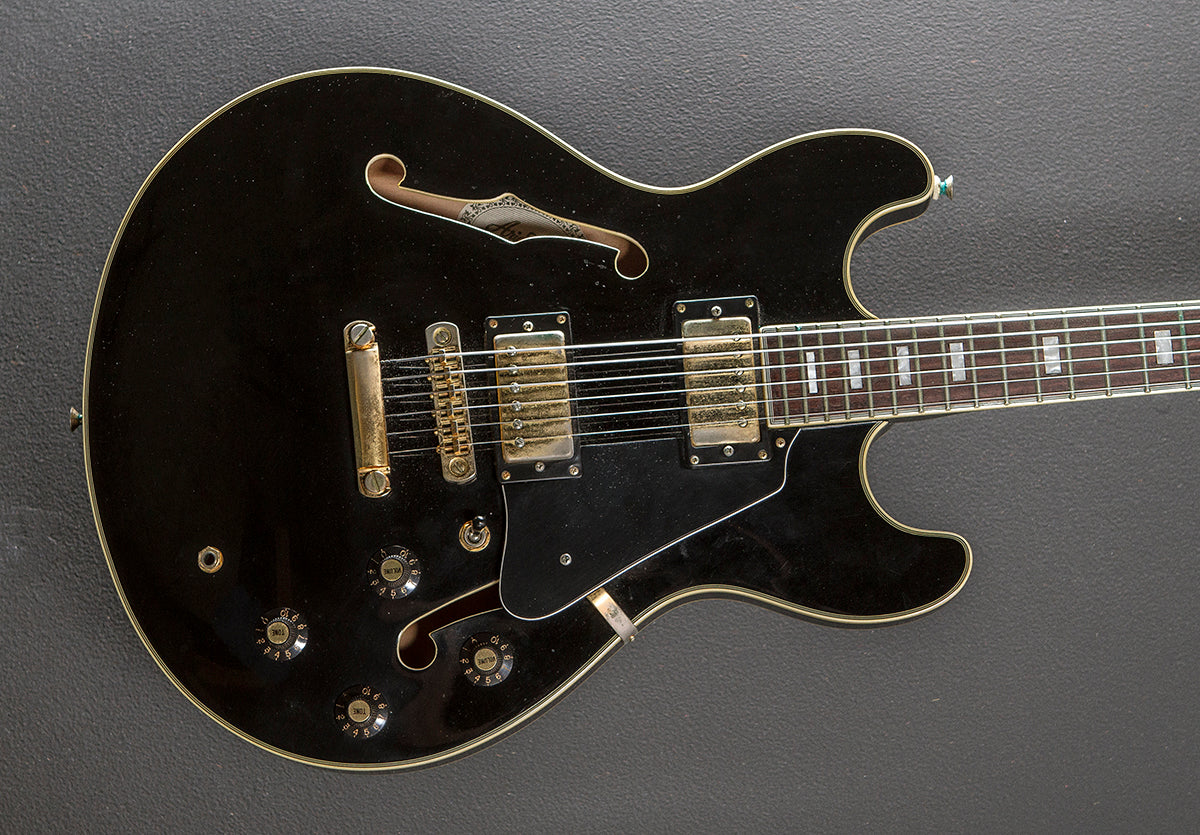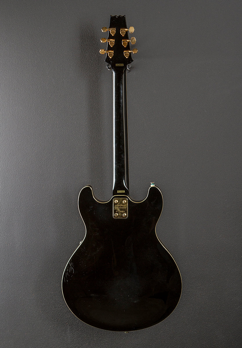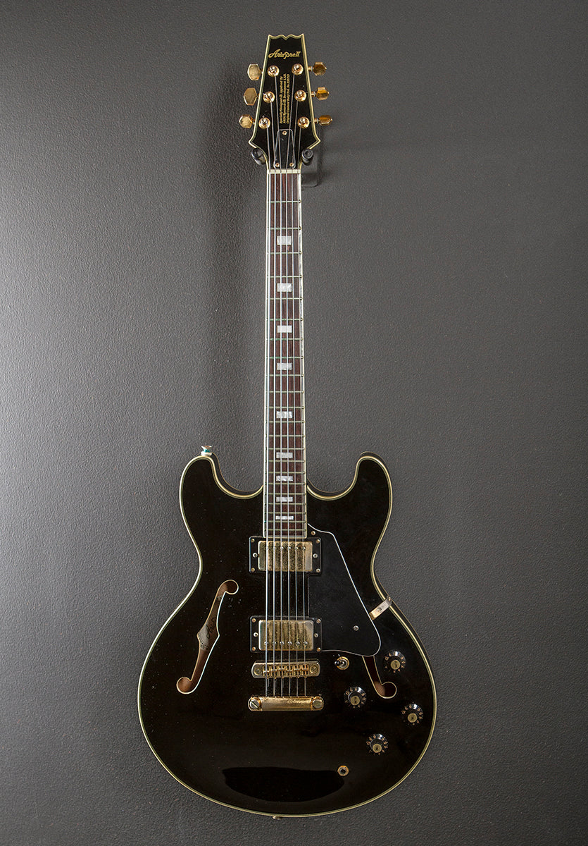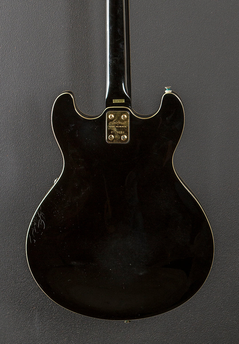 Black, Made in Korea, Gloss finish, Hollow laminated Maple body with the sound block under the bridge, Slim C shaped Mahogany neck with a bound 12" radius Rosewood fingerboard and medium frets, 24.75" scale length, 1 11/16th" nut width, Stock humbucking bridge and neck pickups, 3-way toggle switching with the volume and tone controls for each pickup, Tune-o-matic bridge and stop tailpiece, Cast/sealed tuners, The neck thickness is .79″ at the first and .91″ at the 12th frets, 7.0 pounds, With hardshell case, Very good