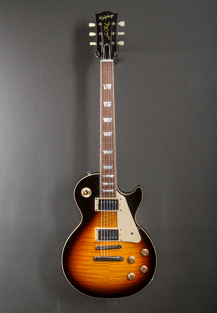 "Made in collaboration with Gibson™ Custom, the Epiphone 1959 Les Paul™ Standard is Epiphone’s incredible recreation of the rare vintage classic, updated to be more authentic and true to the originals than ever. It features a mahogany body with a maple top with a AAA flame maple veneer, a one-piece mahogany neck with a comfortable ’59 rounded, medium C profile, long neck tenon, and Gibson-style “open book” R9 headstock shape, VOS (Vintage Original Sheen) finish, Gibson Custombucker humbucking pickups, Switchcraft® selector switch and 1/4” output jack, CTS® pots, 50s era wiring, Mallory™ capacitors, non-beveled pickguard, Epiphone Deluxe vintage tuners with Keystone buttons, and a vintage-style brown and pink hardshell case. Play one today, and prepare to be amazed!"