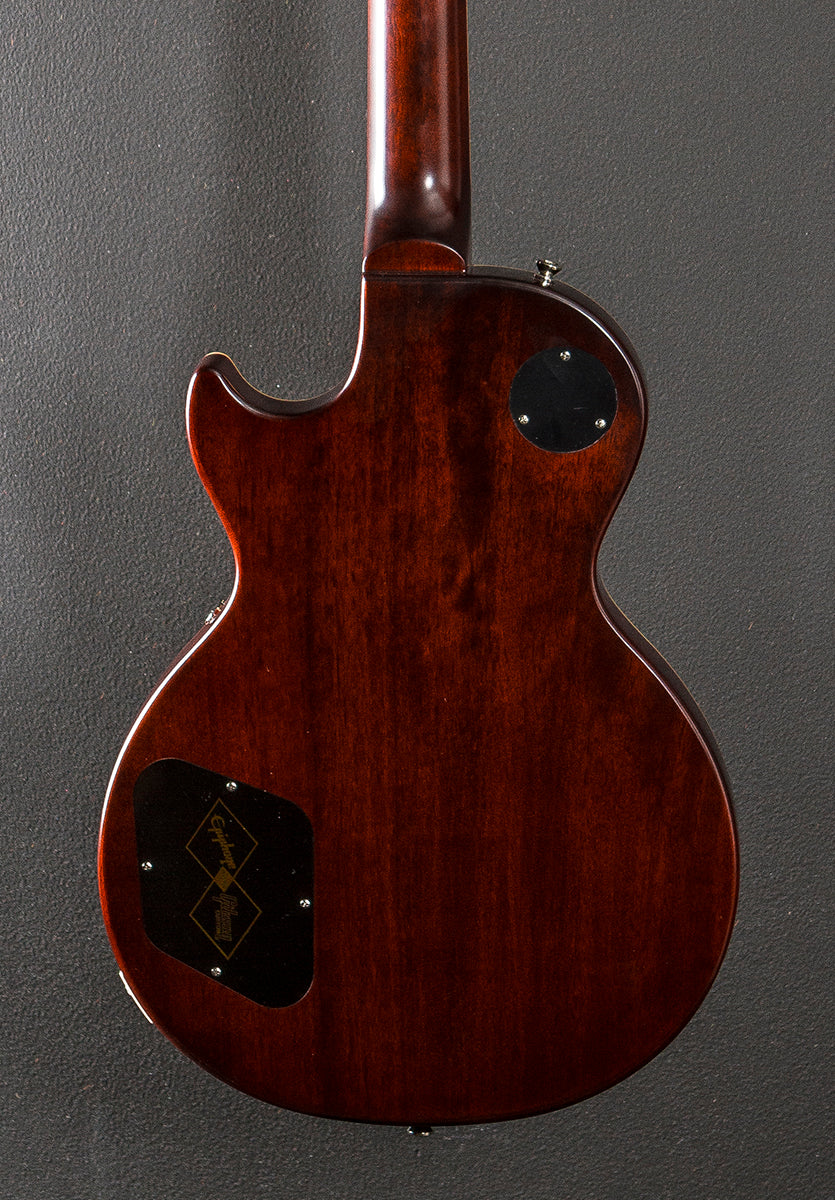 Tobacco Burst, VOS (vintage original sheen) polyurethane finish, Maple top with a AAA Flame Maple veneer, Mahogany body, 1959 rounded medium C shaped Mahogany neck, Bound 12” radius Indian Laurel fingerboard with the mother of pearl trapezoid inlays and medium jumbo frets, 24.75” scale length, 1.692″ nut width, Gibson Custombucker bridge and neck pickups, 3-way toggle switching with the volume and tone controls for each pickup, ABR-1 tune-o-matic bridge and Gibson historic reissue stop bar tailpiece, Epiphone deluxe tuners with the keystone buttons, 8.4 pounds, With the vintage style hardshell case
