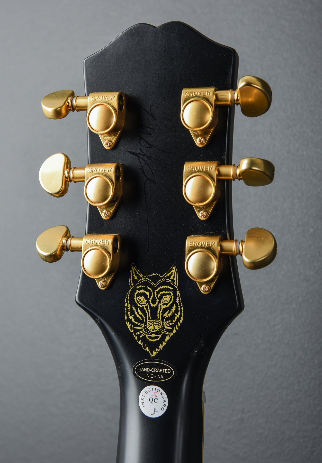 "Emily Wolfe, a triple-threat rock & roll singer-songwriter-guitarist from Austin, Texas, is breathing new life into classic rock & roll with her incendiary guitar chops and original songwriting. Wolfe also lent her creativity to the development of her new signature Sheraton Stealth. The Indian laurel fingerboard has 22 medium jumbo frets, and mother of pearl block inlays with abalone lightning bolts. The headstock features the popular 60s Kalamazoo shape; it has a mother of pearl tree of life inlay on the front, Emily's Wolfe logo, and a black gloss Emily Wolfe "stealth" signature on the rear, and it is outfitted with Grover® Rotomatic® tuning machines and a Graph Tech® nut. An Epiphone LockTone™ Tune-O-Matic™ bridge and Stop Bar tailpiece hold down the other end of the strings and contribute to the impressive sustain of the instrument. The electronics include full-sized Epiphone Alnico Classic PRO™ humbucker™ pickups that are paired with CTS® potentiometers for smooth control over individual pickup volume and overall tone. Finished in Black Aged Gloss that is paired with lightly aged gold hardware. An EpiLite™ case is included."
