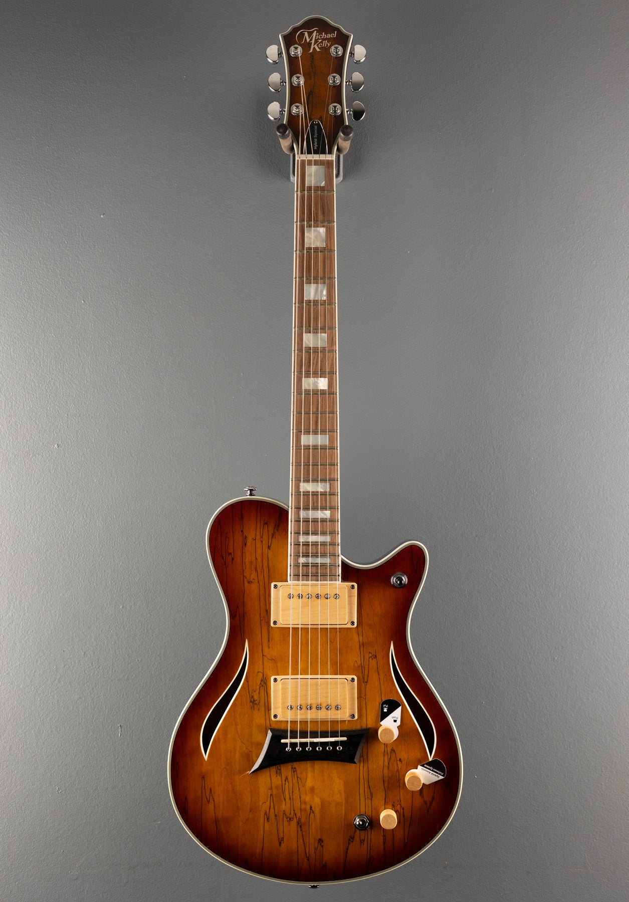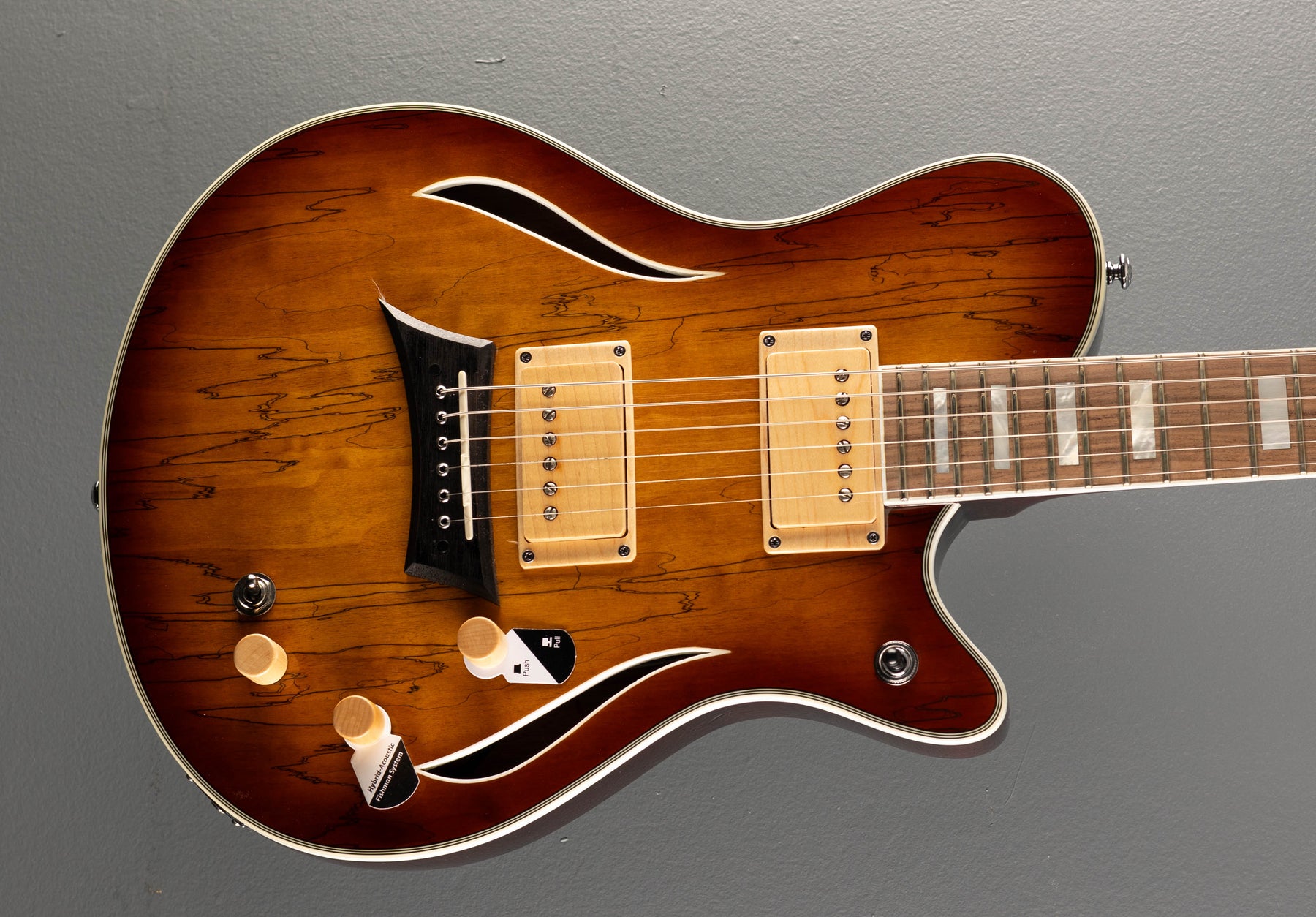 Spalted Maple Burst, Gloss finish, Bound Spalted Maple top, Chambered Mahogany body, Modern C shaped Mahogany neck, Bound 12" radius Pau Ferro fingerboard with the block inlays and medium jumbo frets, 24.75" scale length, 1 11/16th" nut width, Rockfield SWC humbucking bridge and neck pickups plus the Fishman Powerchip/under-saddle pickup system, 3-way toggle switching with the push/pull coil tap volume/master tone controls plus a 3-way toggle switch and blend control for the Fishman Powerchip/under-saddle pickup, Grover mini tuners, 6.9 pounds, Case not included
