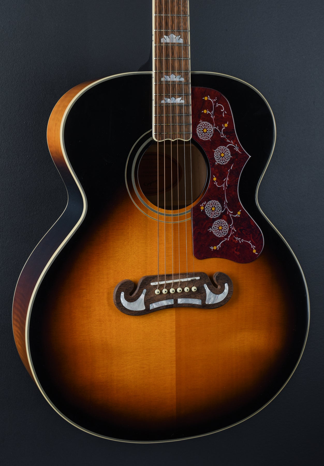 Vintage Sunburst, Aged Gloss Finish, Super Jumbo Body Shape, Solid Sitka Spruce Top with a Two-Ring Rosette and Quartersawn Spruce Bracing, Solid Figured Maple Back and Sides with Multi-Ply Ivory/Black Top and Back Binding, 1960's Slim Taper D Shaped Two-Piece Maple Neck with a Mahogany Center Strip, Bound 12" Radius Laurel Fingerboard with Mother of Pearl Graduated Crown Inlays and Medium Jumbo Frets, 25.5" Scale Length, 1.692" Nut Width, Epiphone Deluxe Tuners, Fishman Presys VT Pickup System, Case Not Included.