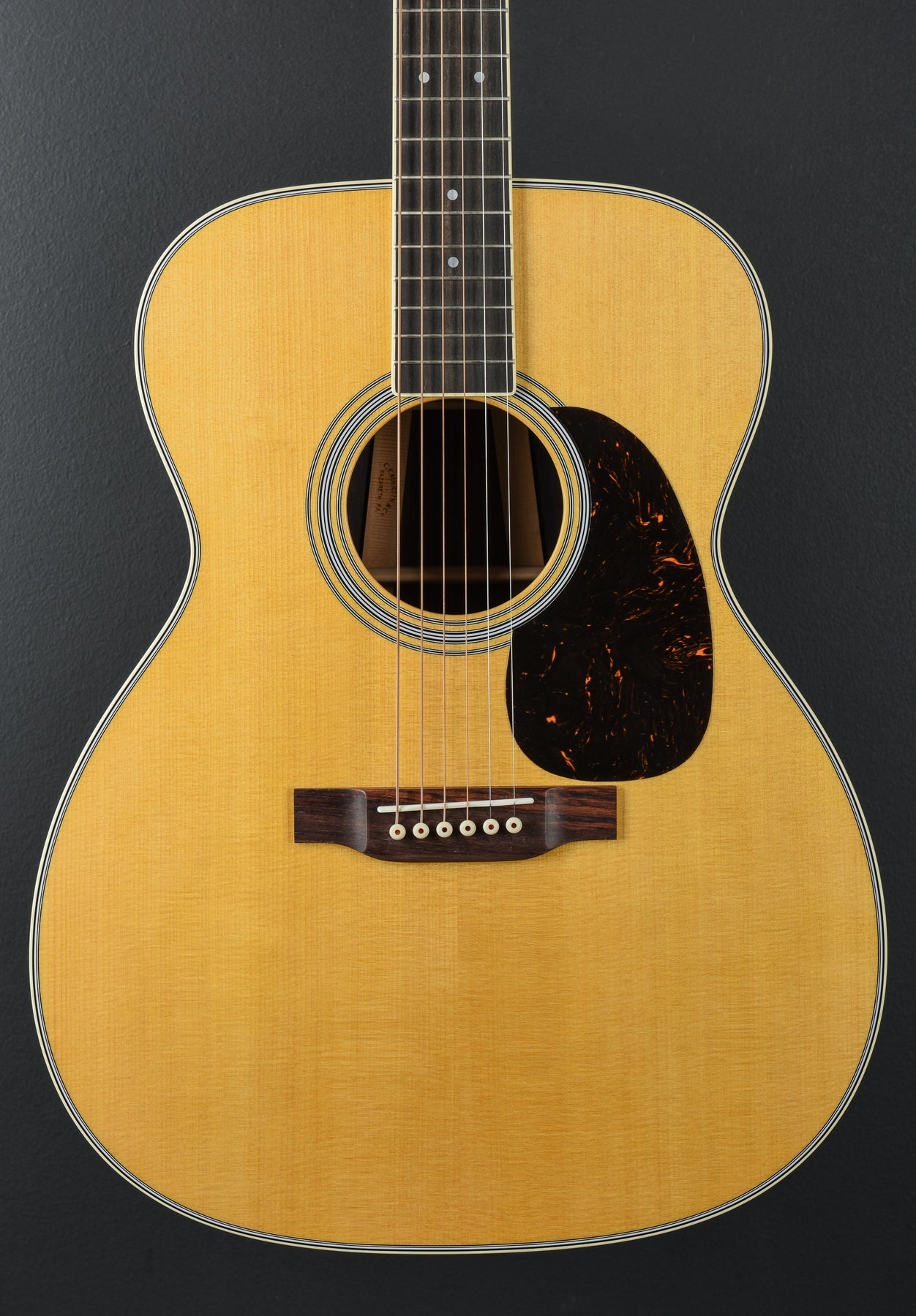 Natural, Gloss top and body finish, M-14 Fret (0000-14 Fret) body shape, Solid Sitka Spruce top, Forward shifted scalloped X bracing, Style 28 Multi-stripe Rosette, White binding with the multi-stripe top/ back/side inlay, Three piece solid East Indian Rosewood back and solid East Indian Rosewood sides, Style 35 back purfling, Ebony fingerboard with the Style 38 Mother of Pearl position markers on a modified low oval w/high performance taper shaped select hardwood neck, 25.4″ scale length, 1 3/4" nut width, Grover tuners, With hardshell case