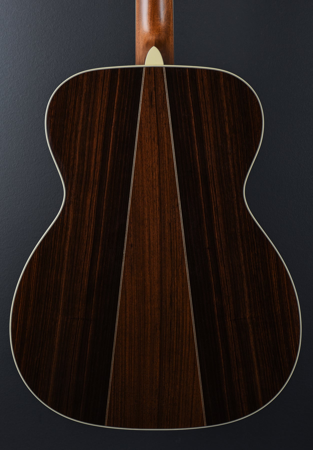 “A three-piece back, bound neck, and body that's wide like a jumbo and thin like a 000, for a sound as distinctive as those who play it. East Indian rosewood and Sitka spruce work with scalloped bracing to produce a tone that's big, balanced and ideal for studio recordings. Enclosed gear tuners and a modified low oval neck with narrow taper offer superb playability.”