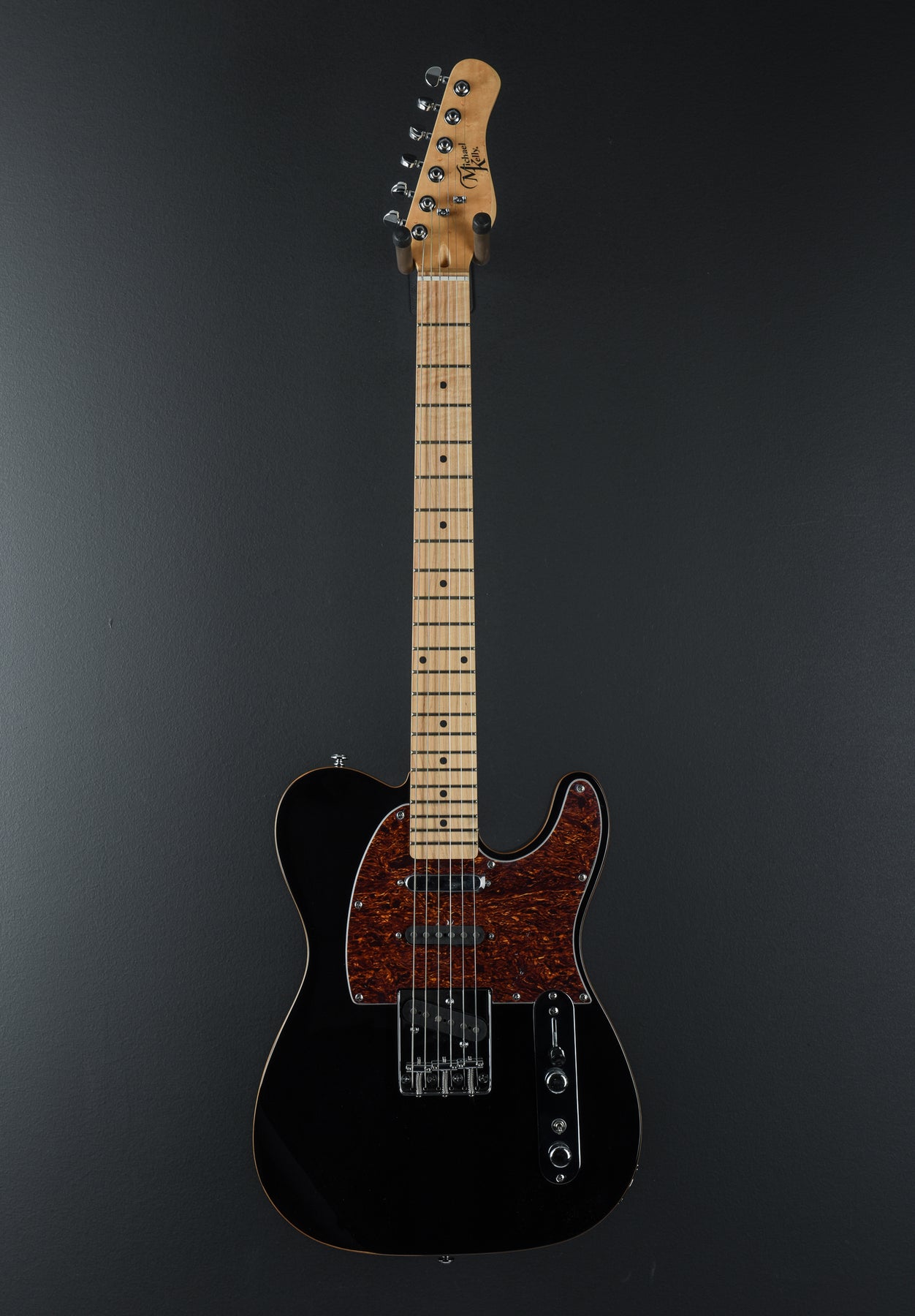 Black, Gloss body finish, Alder body with the arm and rear contours, Modern C shaped Hard Maple neck, 10.5" to 16" compound radius Hard Maple fingerboard with the dot inlays and medium frets, 25.5" scale length, 1 11/16th" nut width, Rockfield Classic T bridge/Single coil T middle/Vintage T neck pickups, 3-way switching with the master volume and tone controls plus the mini-toggle switch, String thru body vintage ashtray bridge with the three barrel steel saddles, Cast/sealed tuners, 7.95lbs, Case not included