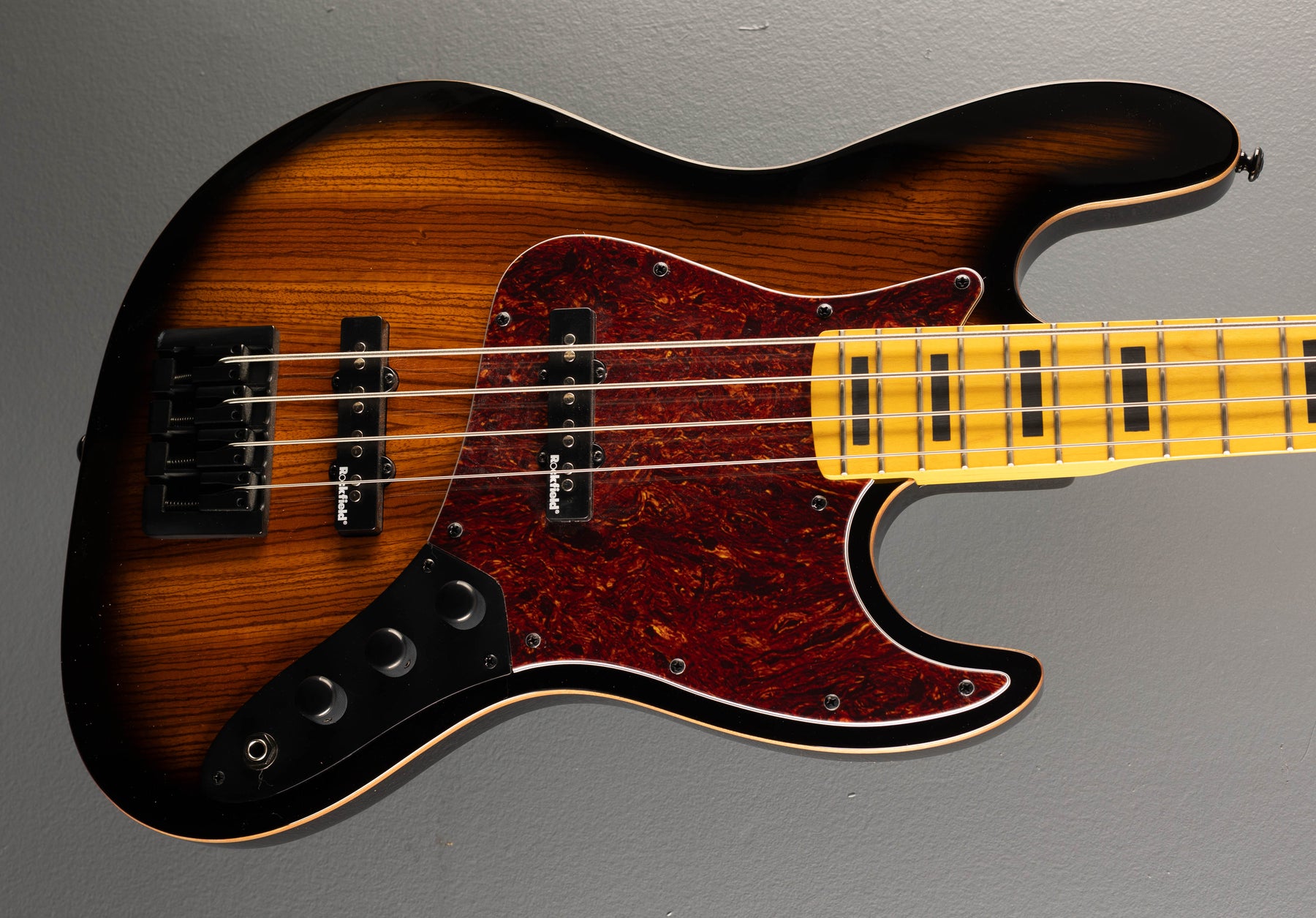 Zebra Burst, Gloss body finish, Zebrawood top on an Alder body, C shaped Rock Maple neck, 9.5" radius Rock Maple fingerboard with the black block inlays and medium frets, 34" scale length, 1 9/16th" nut width, the neck measures .78" at the 1st and .89" at the 12th frets, Rockfield custom vintage passive J bridge and neck pickups with the volume/volume/tone controls, MK deluxe string thru body bridge and cast/sealed tuners, 9.2 pounds, Case not included