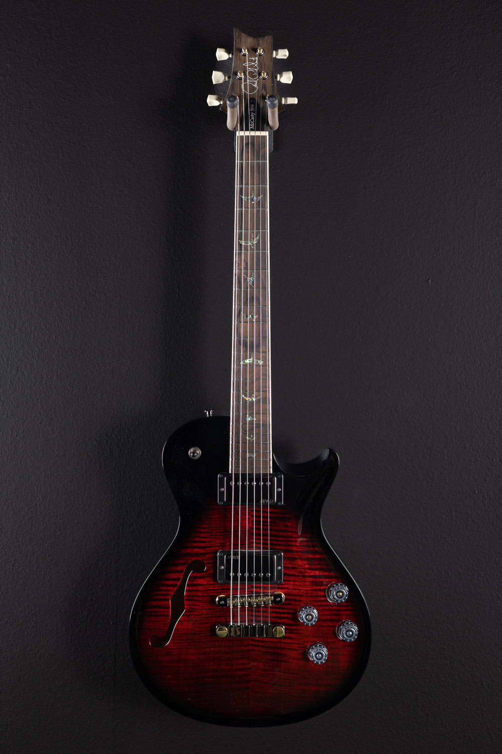 Vampire Mist, Carved Maple 10-top, Semi-hollow Mahogany body, 24.594" scale length, 1 11/16th″ nut width, Pattern Vintage carved Korina neck with the Ziricote Bird inlays and faux Bone binding, 58/15 LT bridge and neck pickups, 3-way toggle switching with the 2 volume and 2 push/pull tone controls, PRS two piece Zinc bridge and tailpiece, PRS vintage style tuners, 7.8 pounds, With hardshell case