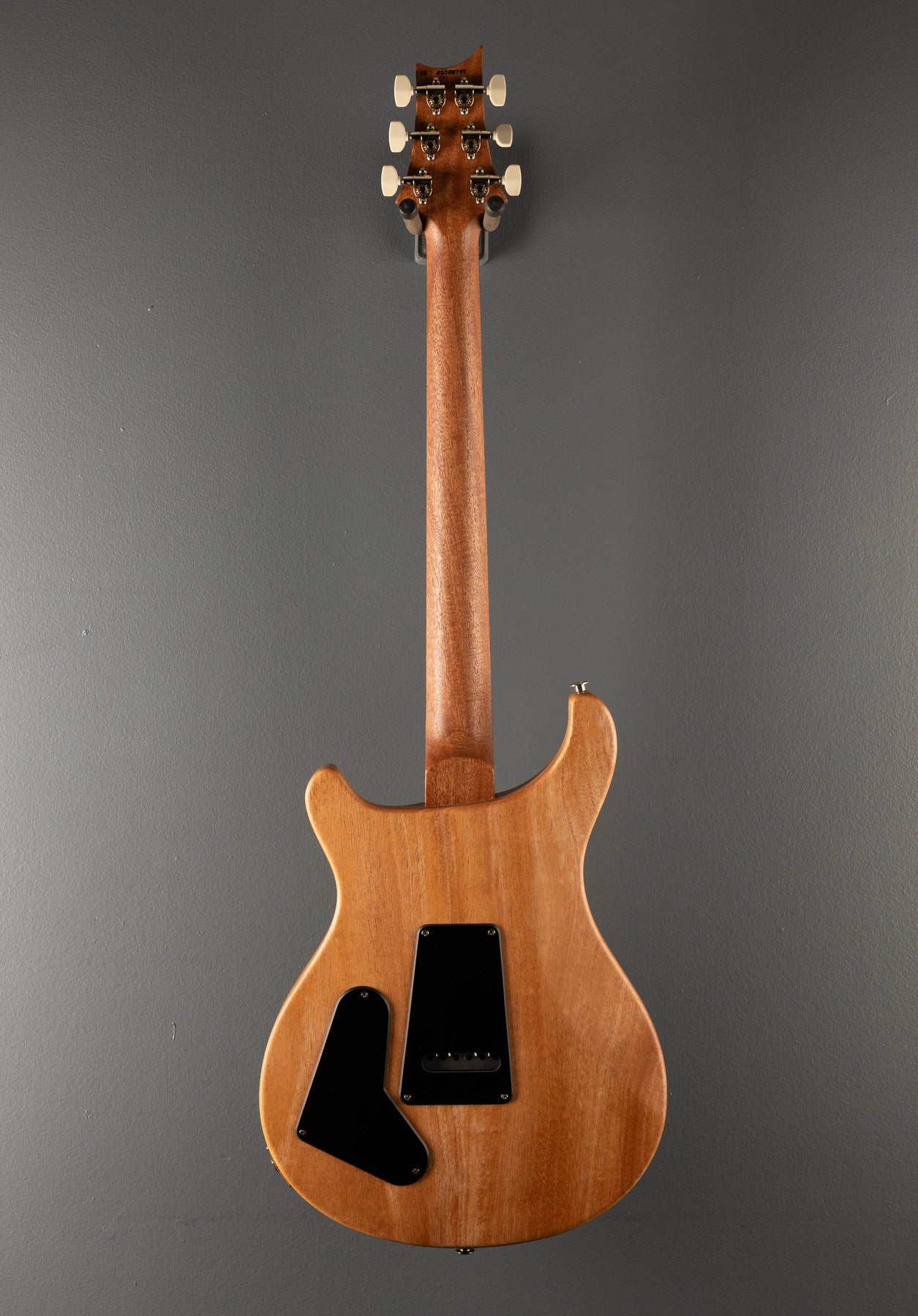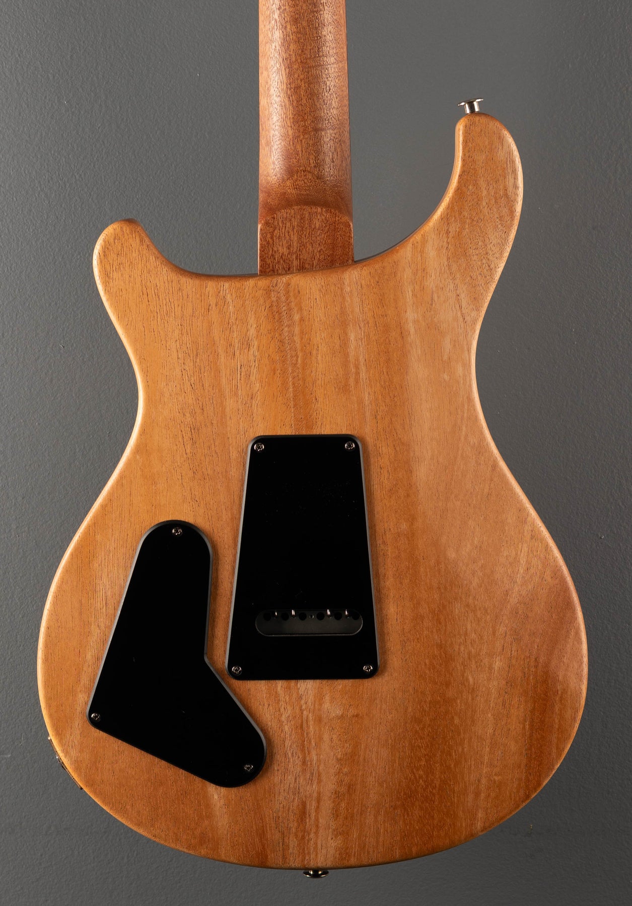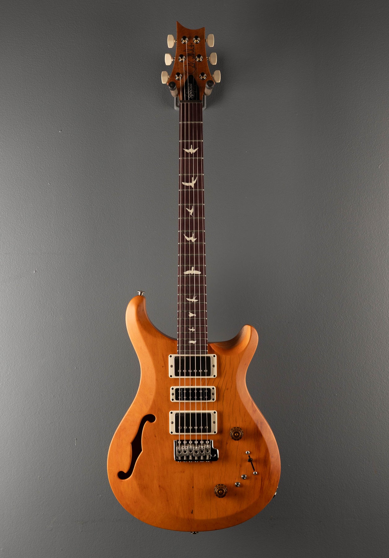 Natural, Satin nitro finish, Asymmetrical beveled Peroba Rosa top with the single F hole, Semi-hollow Mahogany body, Pattern Regular carved Cuban Mahogany neck, 10" radius Guaribu Preto fingerboard with the Bird inlays, 25" scale length, 1 21/32nd” nut width, PRS 58/15 LT bridge and neck pickups plus the PRS Narrowfield middle pickup, 5-way blade switching with the master volume and tone controls plus the two mini-toggle coil tap switches, PRS patented tremolo, PRS Phase III locking tuners with the wing buttons, 7.7 pounds, With gig bag