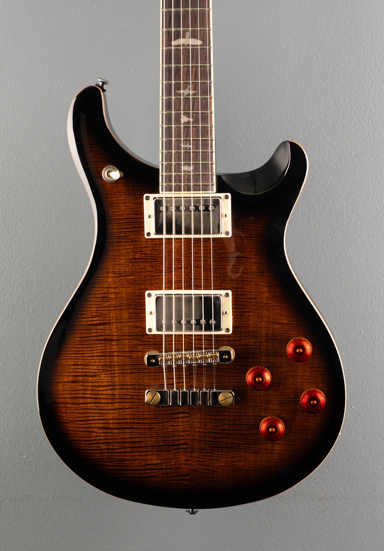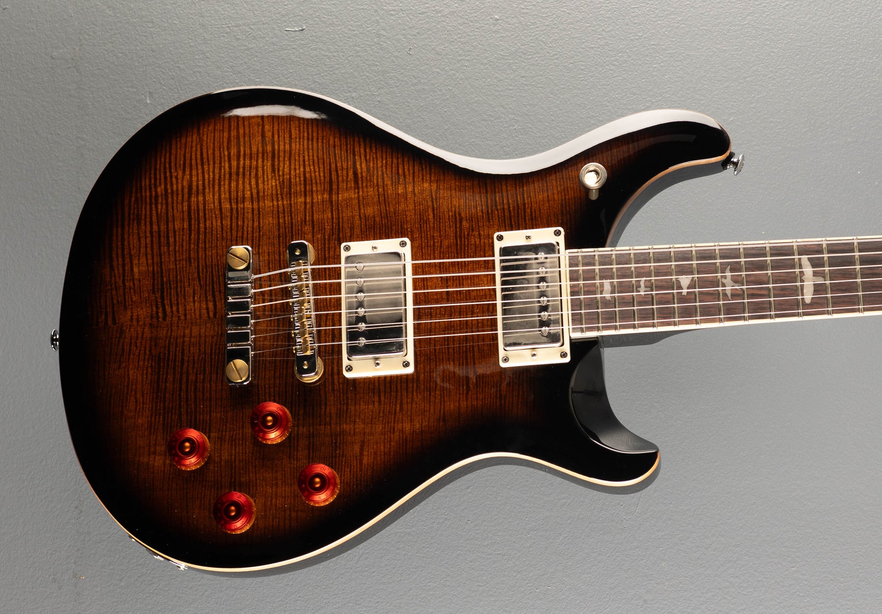 Excellent Condition, Black Gold Sunburst, Shallow violin carved Maple top with a Flame Maple veneer, Pattern Vintage carved Mahogany neck, Bound 10" radius Rosewood fingerboard with the Bird inlays, 24.594” scale length, 1 11/16th" nut width, 58/15 LT "S" bridge and neck pickups, 3-way toggle switching with the volume and push/pull coil tap tone controls for each pickup, PRS two-piece bridge and vintage style tuners, 7.4 pounds, With gig bag.