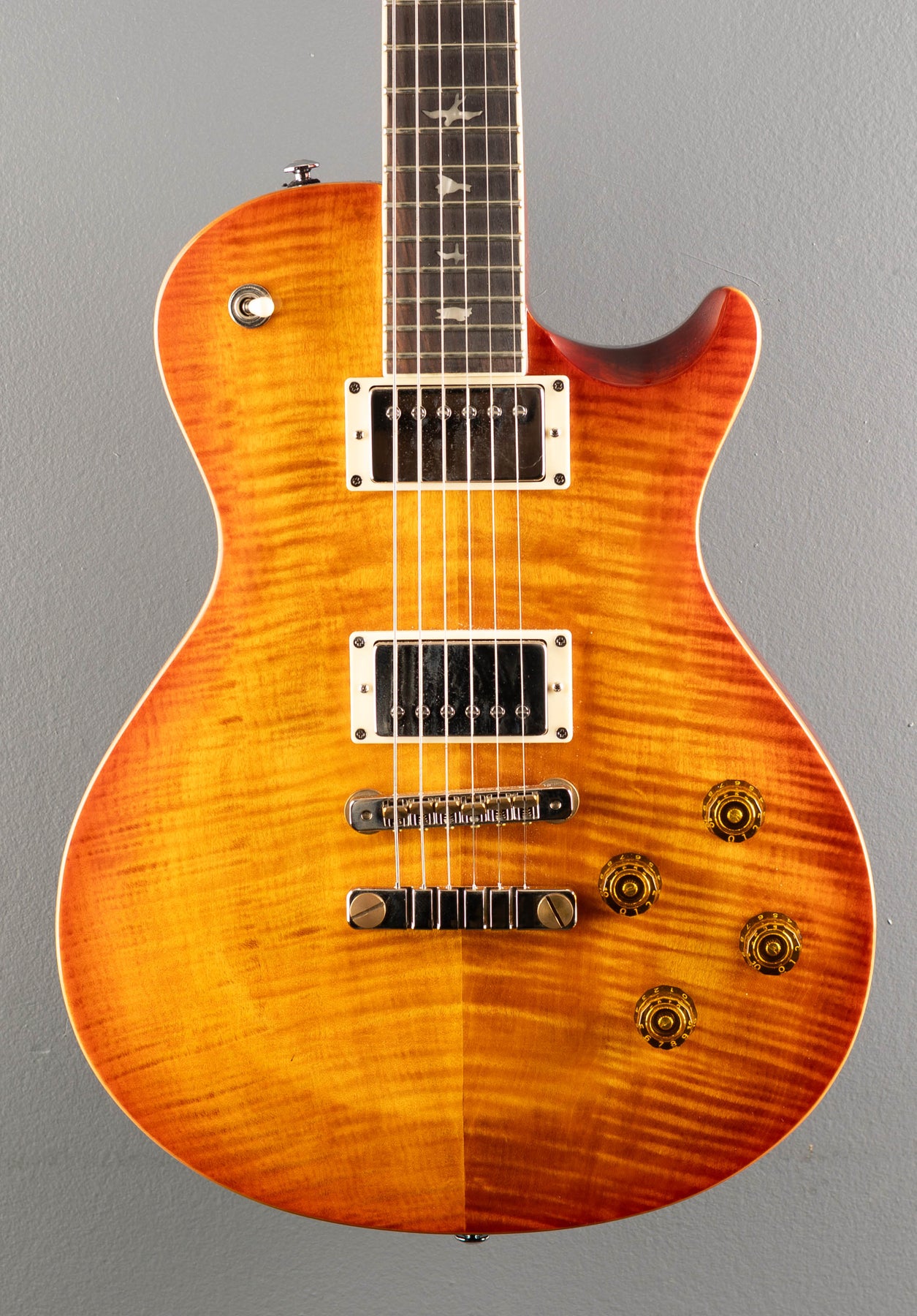Excellent Condition, Vintage Sunburst, Shallow violin carved Maple top with a Flame Maple veneer, Pattern Vintage carved Mahogany neck, Bound 10" radius Rosewood fingerboard with the Bird inlays, 24.594” scale length, 1 11/16th" nut width, 58/15 LT "S" bridge and neck pickups, 3-way toggle switching with the volume and push/pull coil tap tone controls for each pickup, PRS two-piece bridge and vintage style tuners, Neck Thickness is .90" at the 1st fret and 1.03" at the 12th, 8.1 pounds, comes with gig bag.