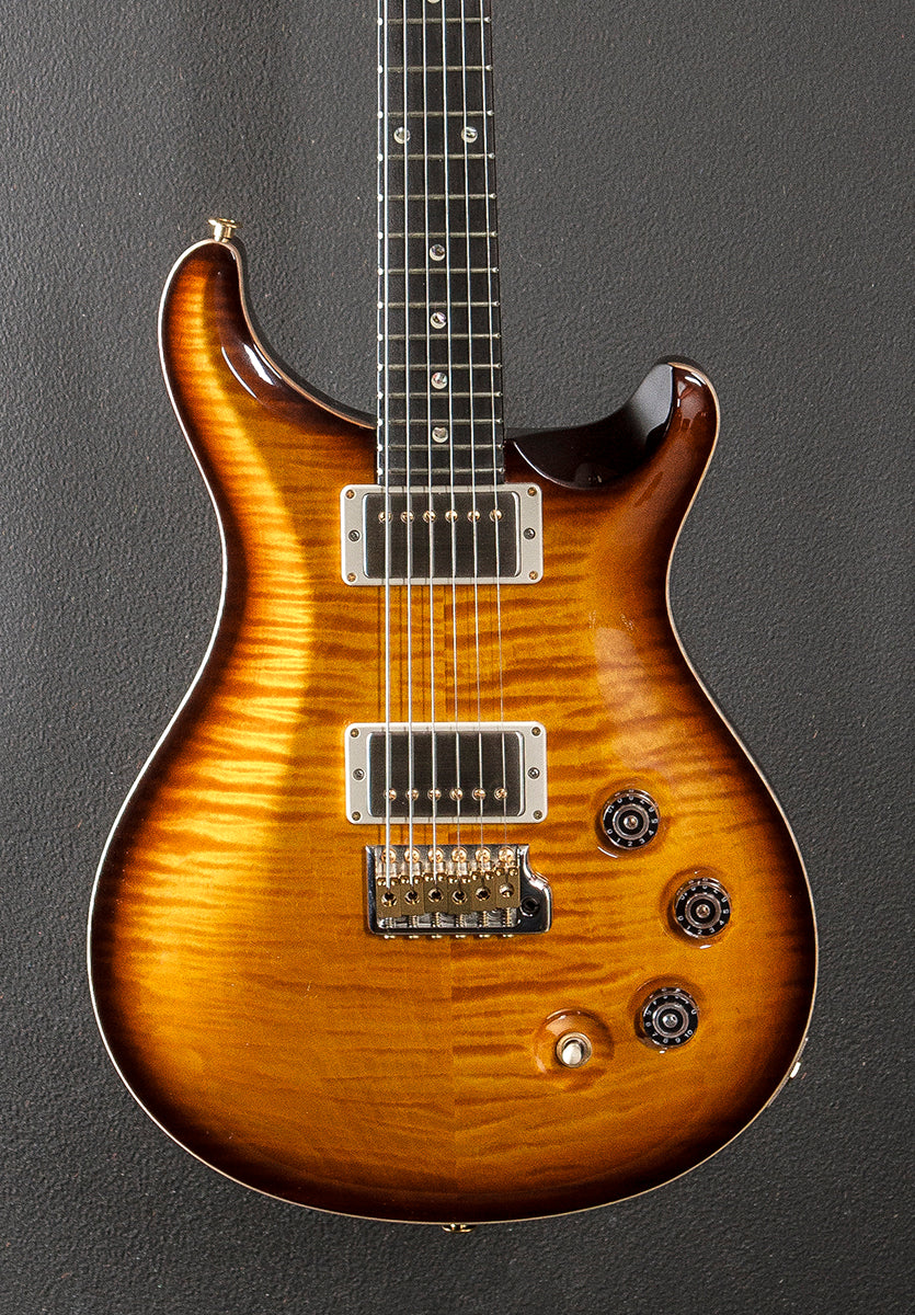 McCarty Tobacco Sunburst, High gloss nitro finish, Violin carved Flame Maple 10 top, Mahogany body, DGT carved Mahogany neck, 10" radius Rosewood fingerboard with the Moon inlays, 25" scale length, 1 11/16th" nut width, PRS DGT bridge and neck pickups, 3-way toggle switching with the volume/volume and push/pull coil tap tone controls, PRS patented Gen III tremolo, PRS Phase III locking tuners with the faux Bone buttons, 8.0 pounds, With hardshell case